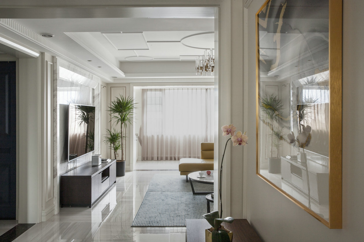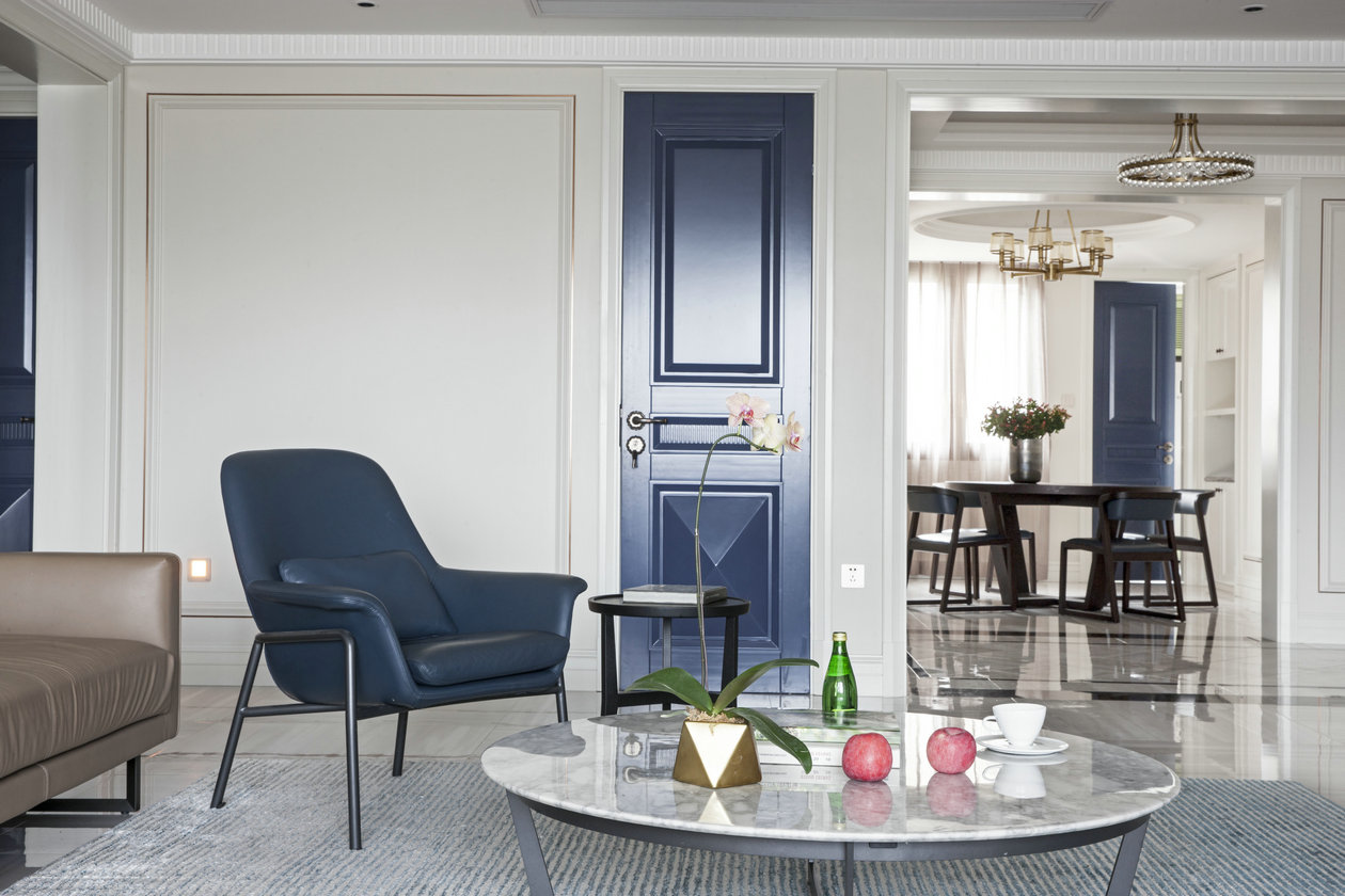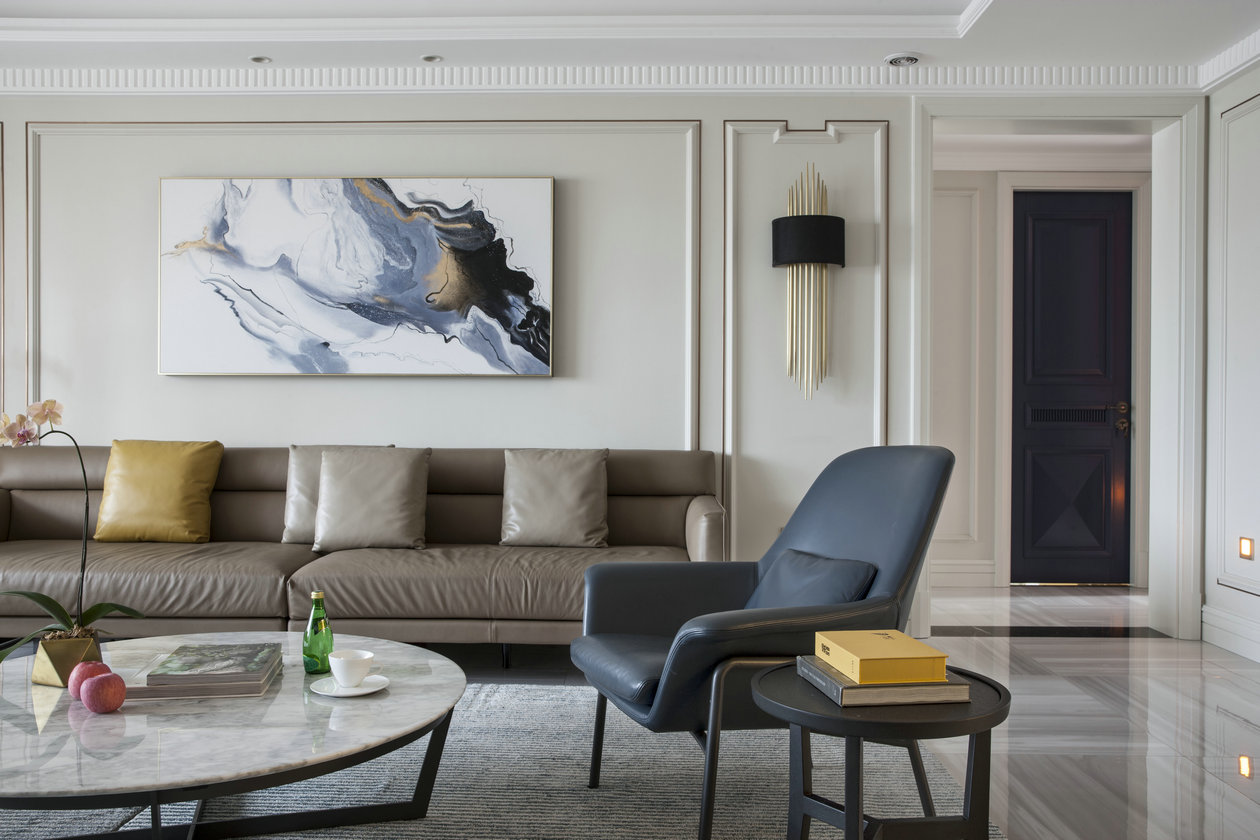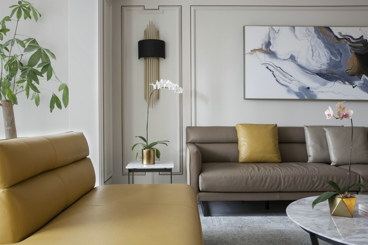 「冗繁削尽留清瘦,画到生时是熟时」,设计也理当如此。在客厅,石膏线和内嵌黄铜装饰取代了繁复的墙板,勾勒出简洁的美式风格基底。