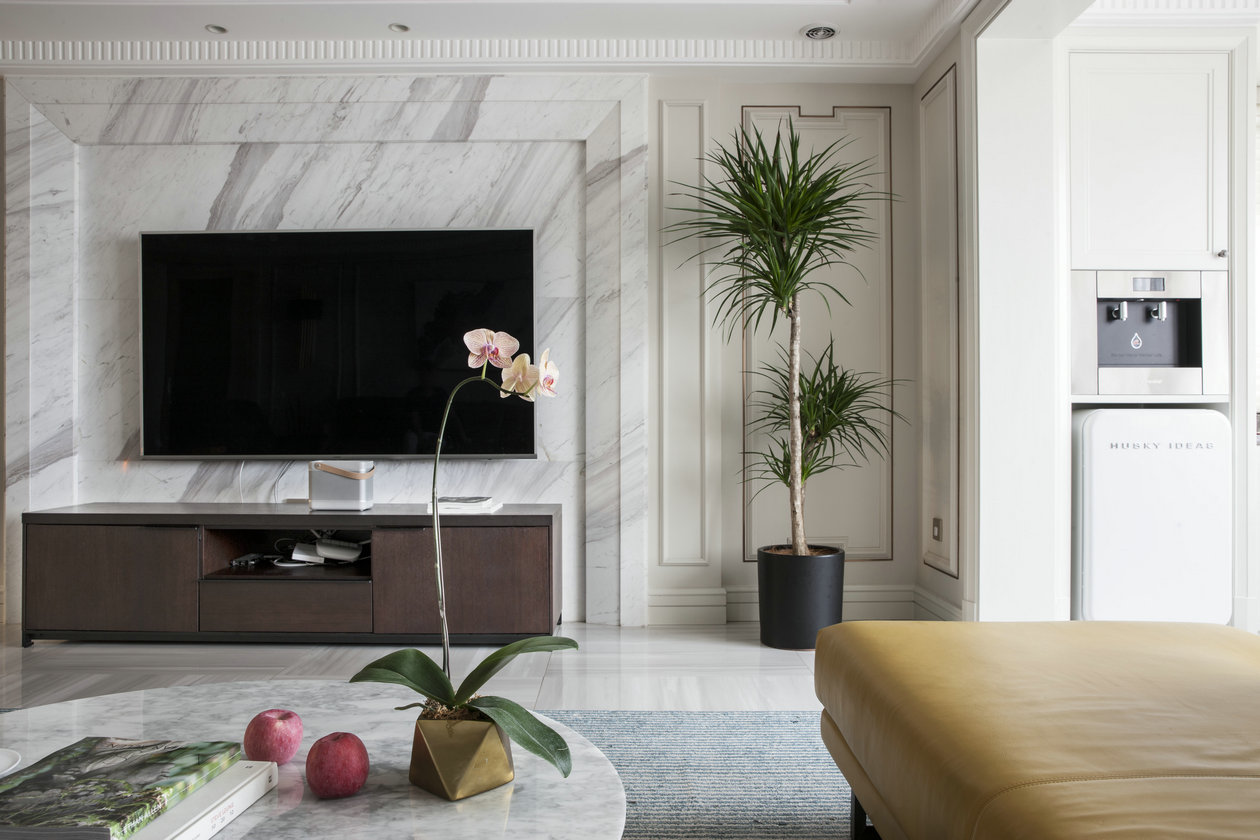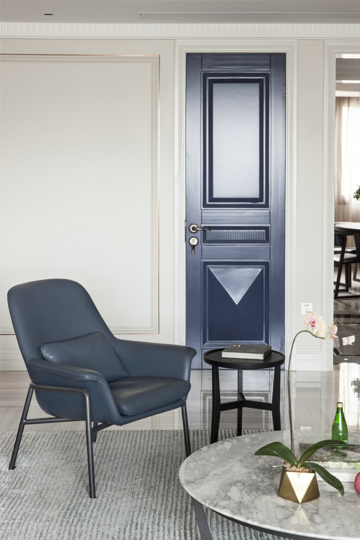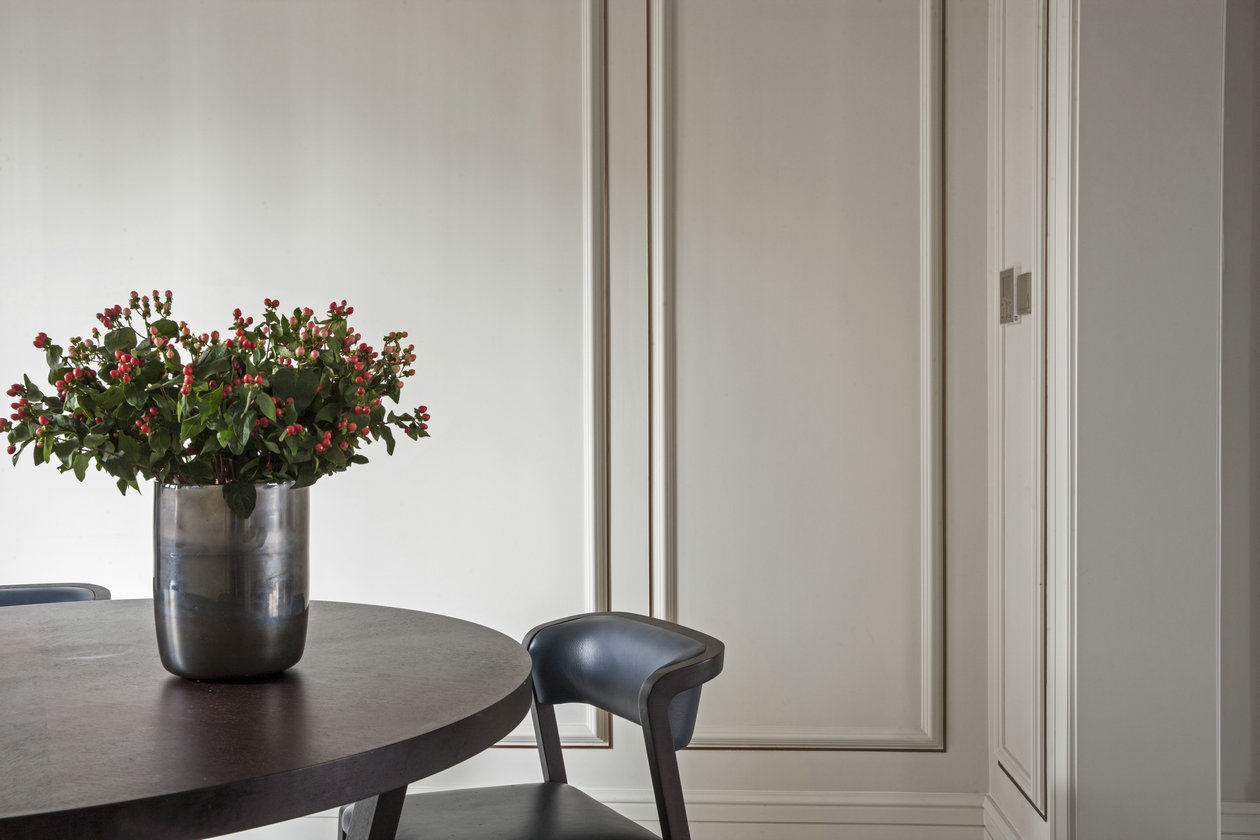「冗繁削尽留清瘦,画到生时是熟时」,设计也理当如此。在客厅,石膏线和内嵌黄铜装饰取代了繁复的墙板,勾勒出简洁的美式风格基底。