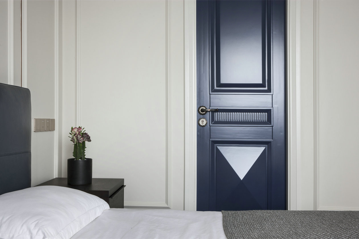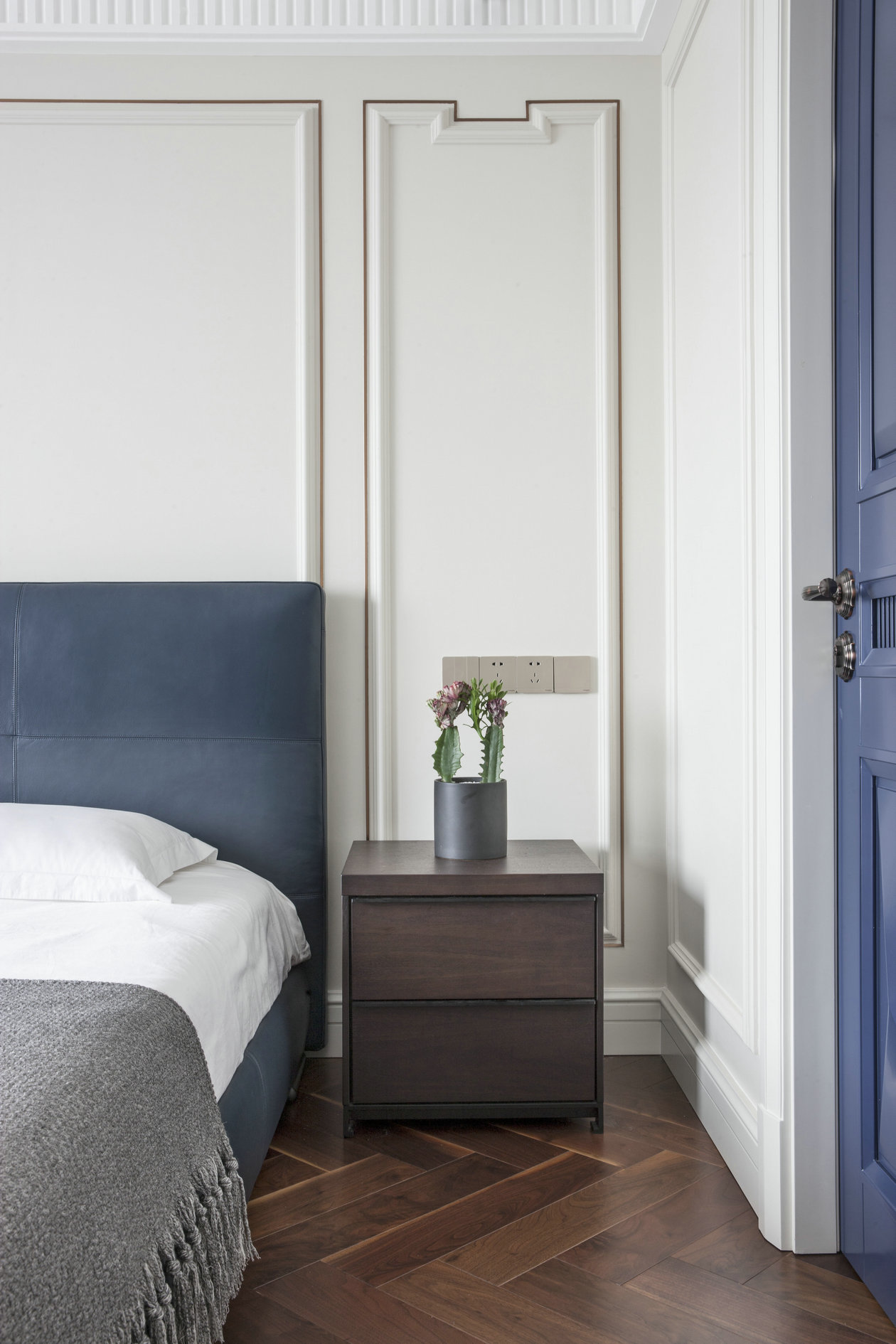 主卧,灰色与深灰蓝的组合率性而稳重,于简约的美式基底中,悠然与诗意绵延不绝。