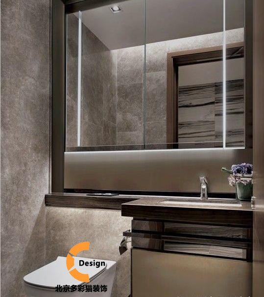 使得电视柜形成一个整体,柜门用的是定制的门板,仿大理石的材质,看起来更显得高级,下面镂空的部分内嵌灯带,矮柜的台面是现代的木板,旁