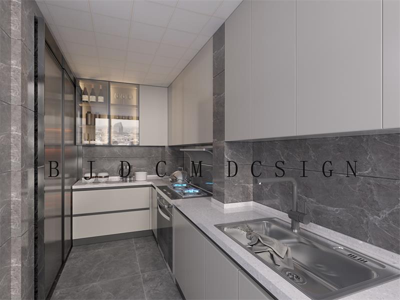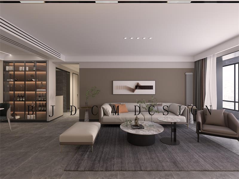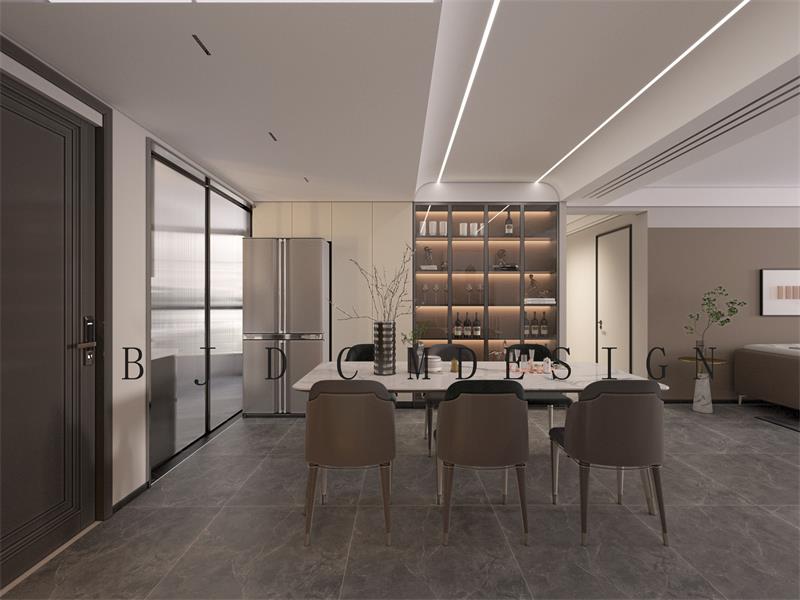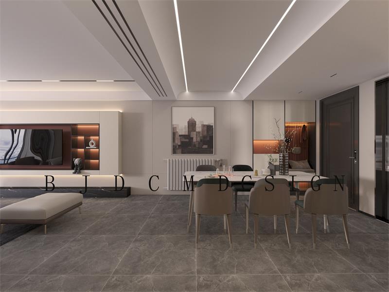 原房高的层高在2700mm左右,为了使空间看起来更开阔,客厅部分做了跌级形式的天花吊顶,同时很和谐的实现了中央空调的功能。整个空间大面积运用了高级而有质感的、低饱和度的色彩以及自然的材质,来表达独特而理性的温暖。
