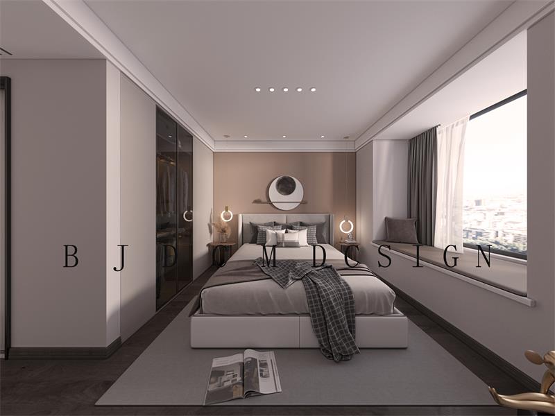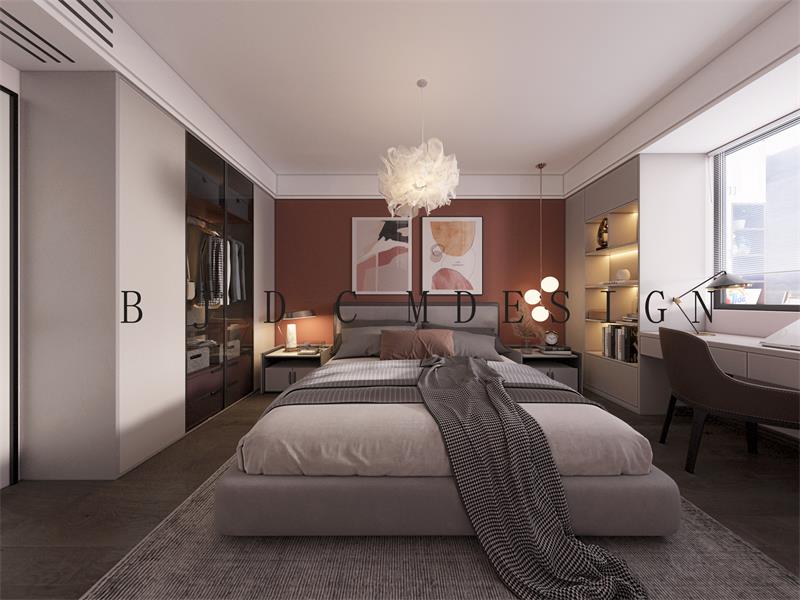 墙面卧室选择了柔和的莫兰迪粉配色, 点缀玻璃柜体提升质感,物品以纯棉质感为主。千鸟格装饰添加了一些活泼的感觉。清造型,极细线条的设计更具时尚感