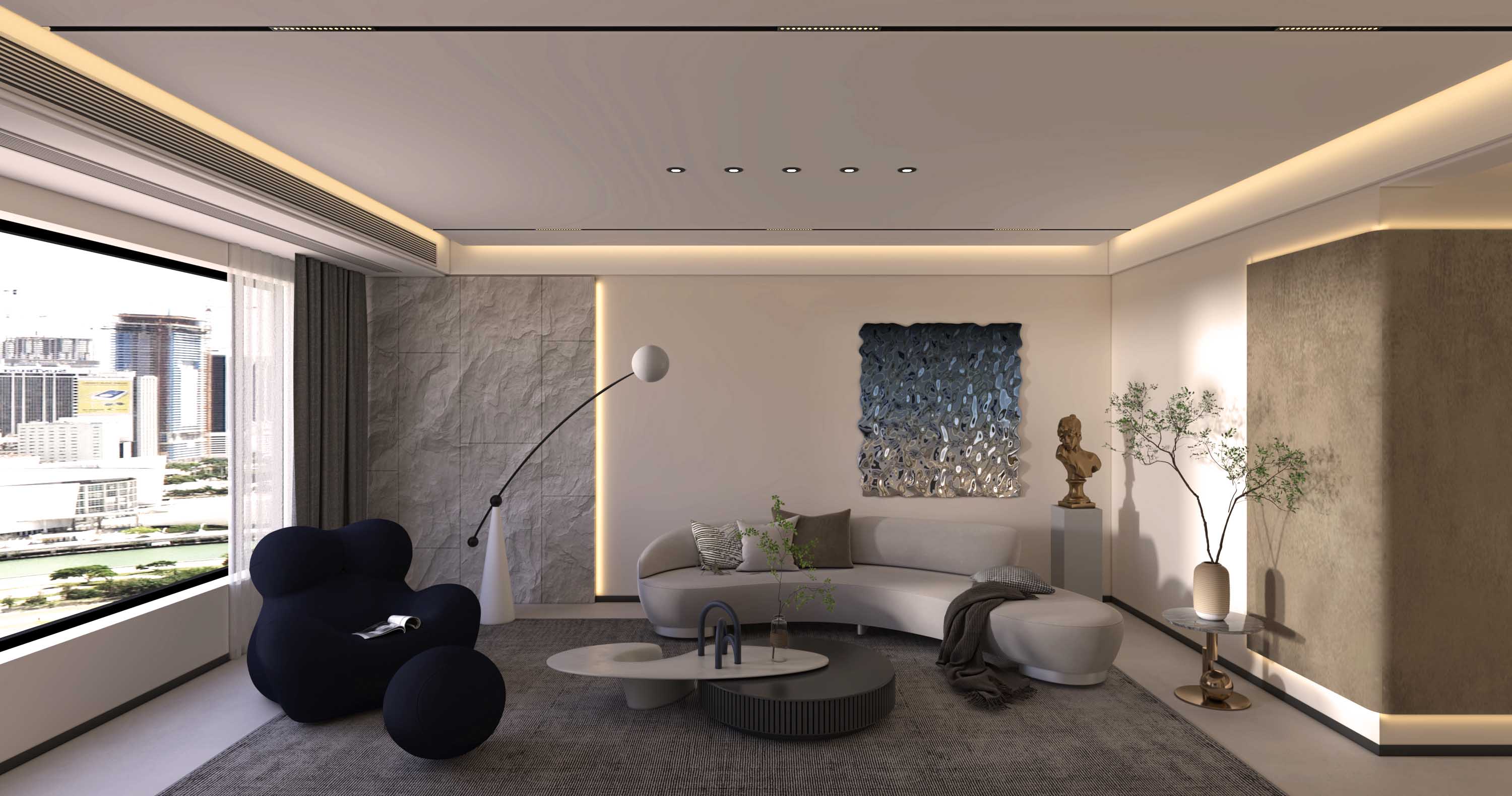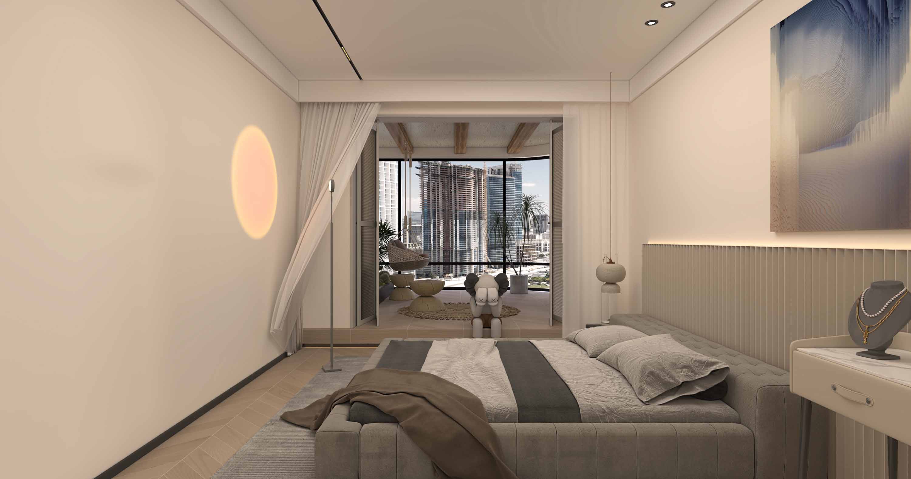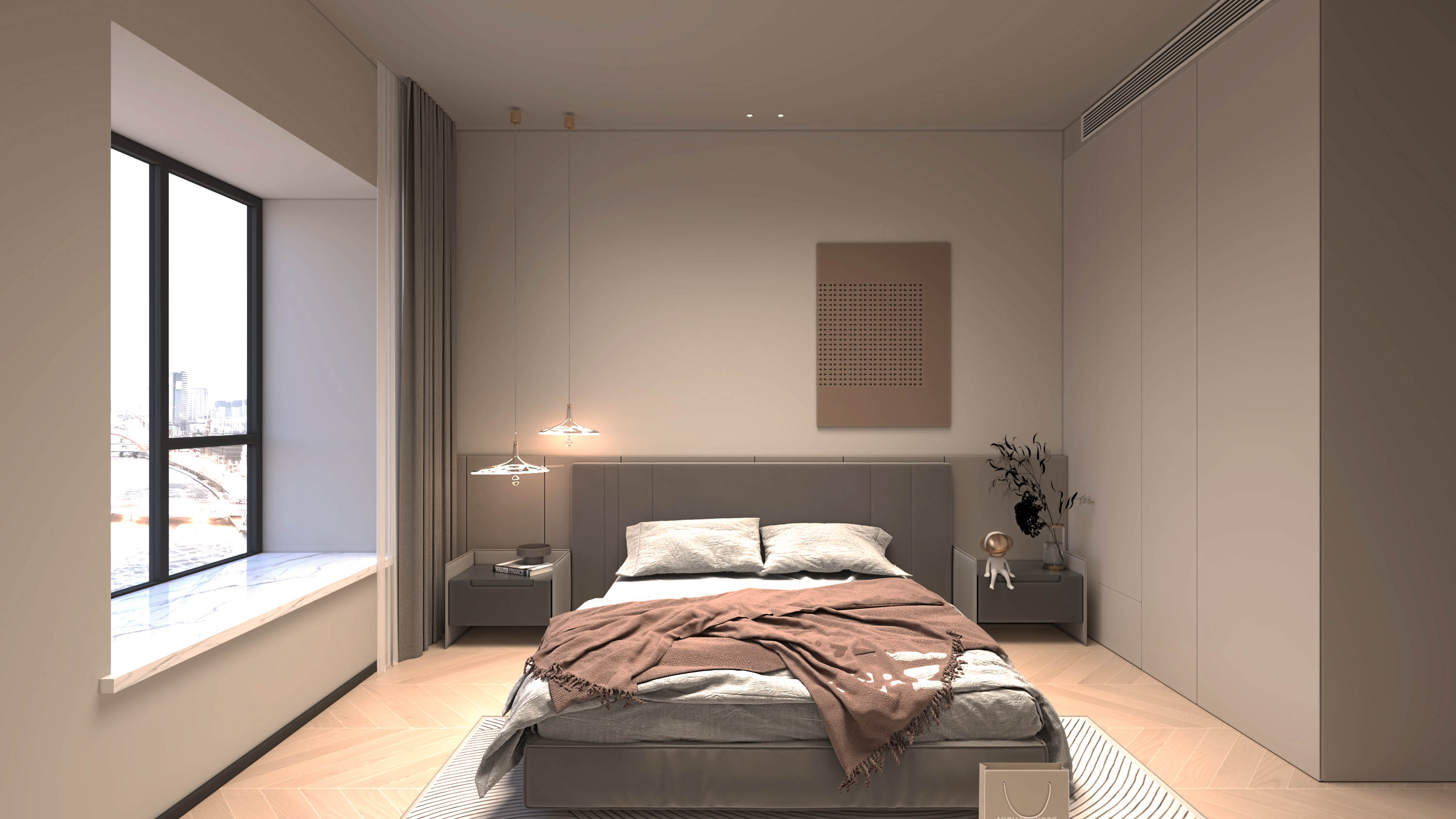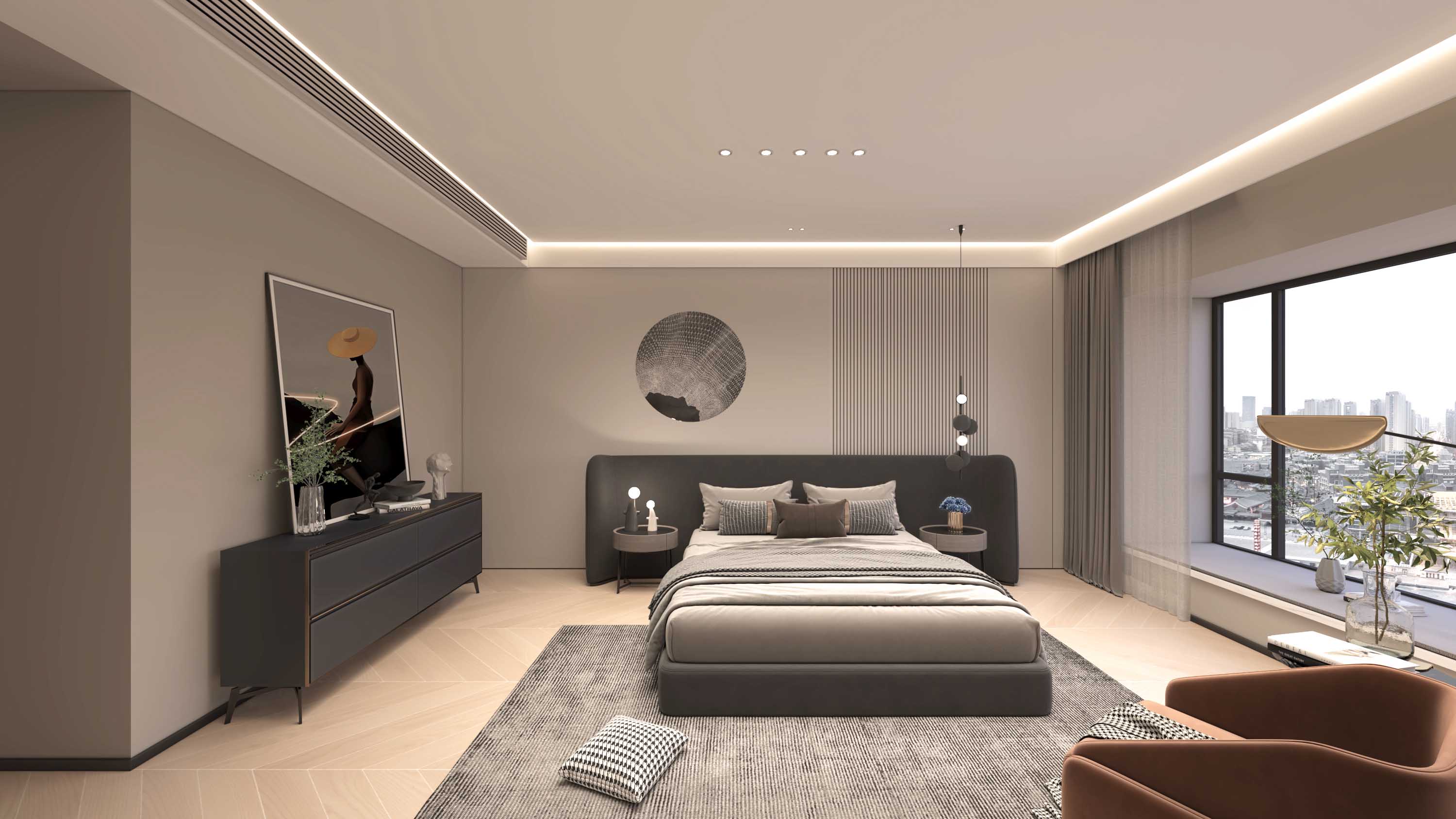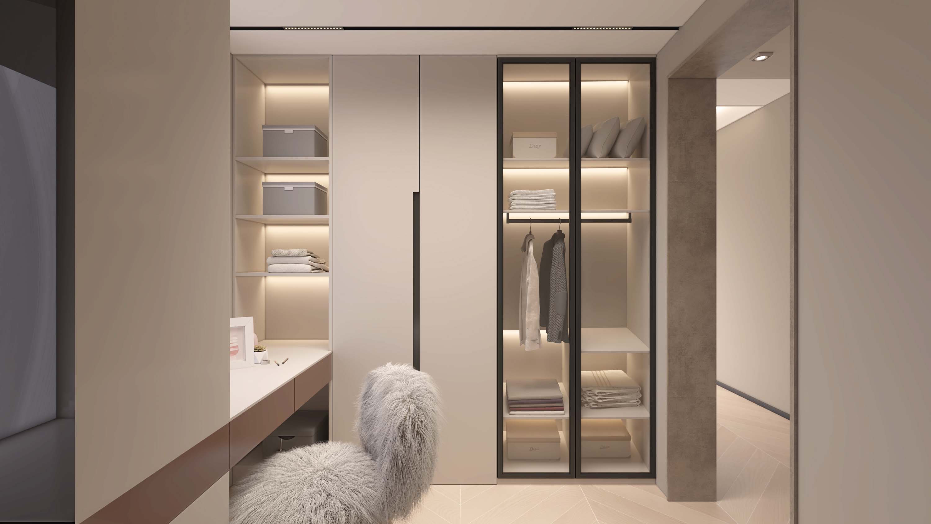 床头的木饰面和米色硬包,床尾乌亮的仿皮草挂毯,照应着房间的金属色,使精致感由内而外地延续至此。