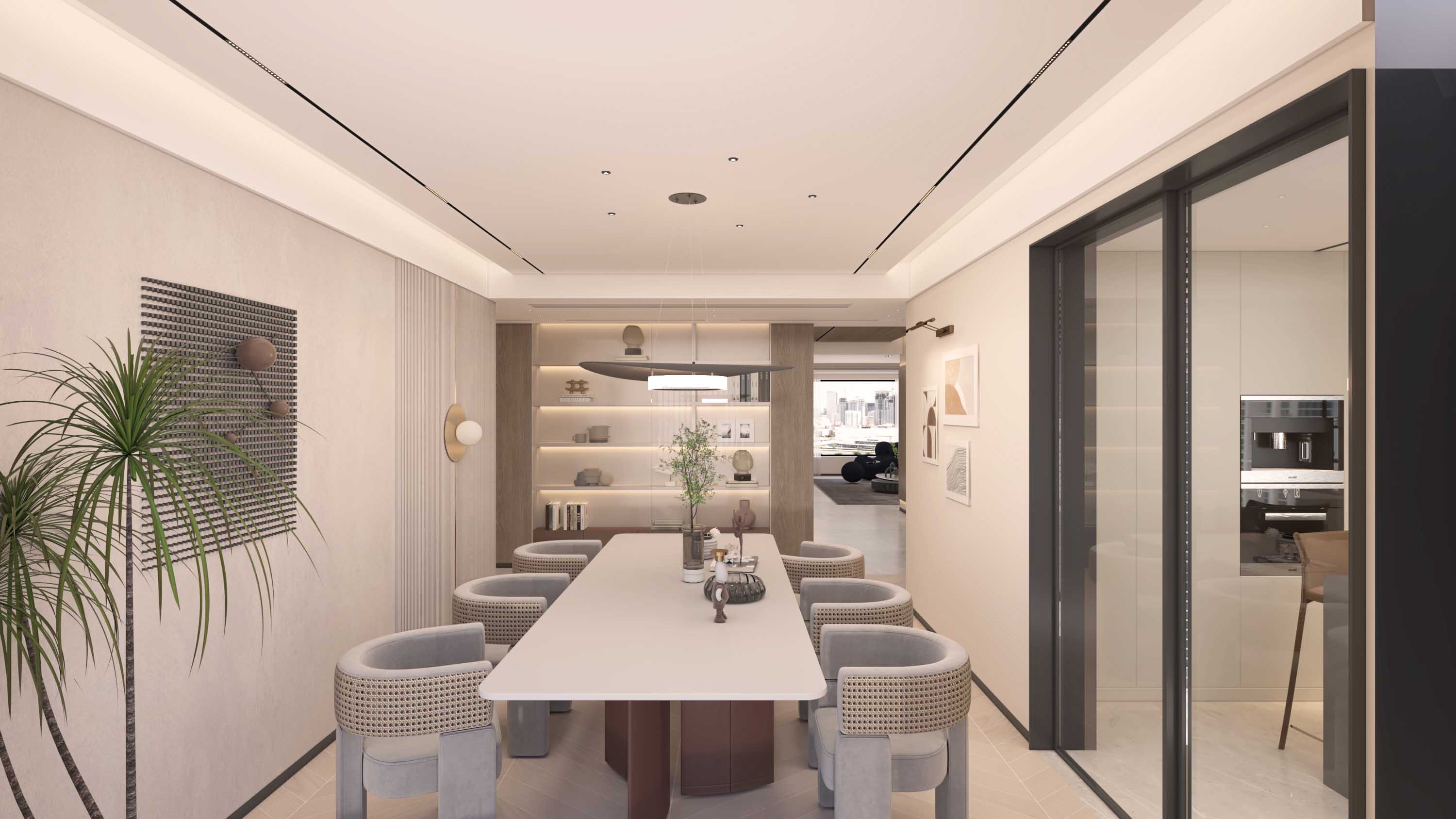 堂皇精致的吊灯,凝聚着全厅的光芒;与别致匠心的画作、艺术品作呼应,像圣光一样引领着居者的精神视觉,客餐厅的艺术气息也得到了升华、不至流于过分的珠光宝气之中。