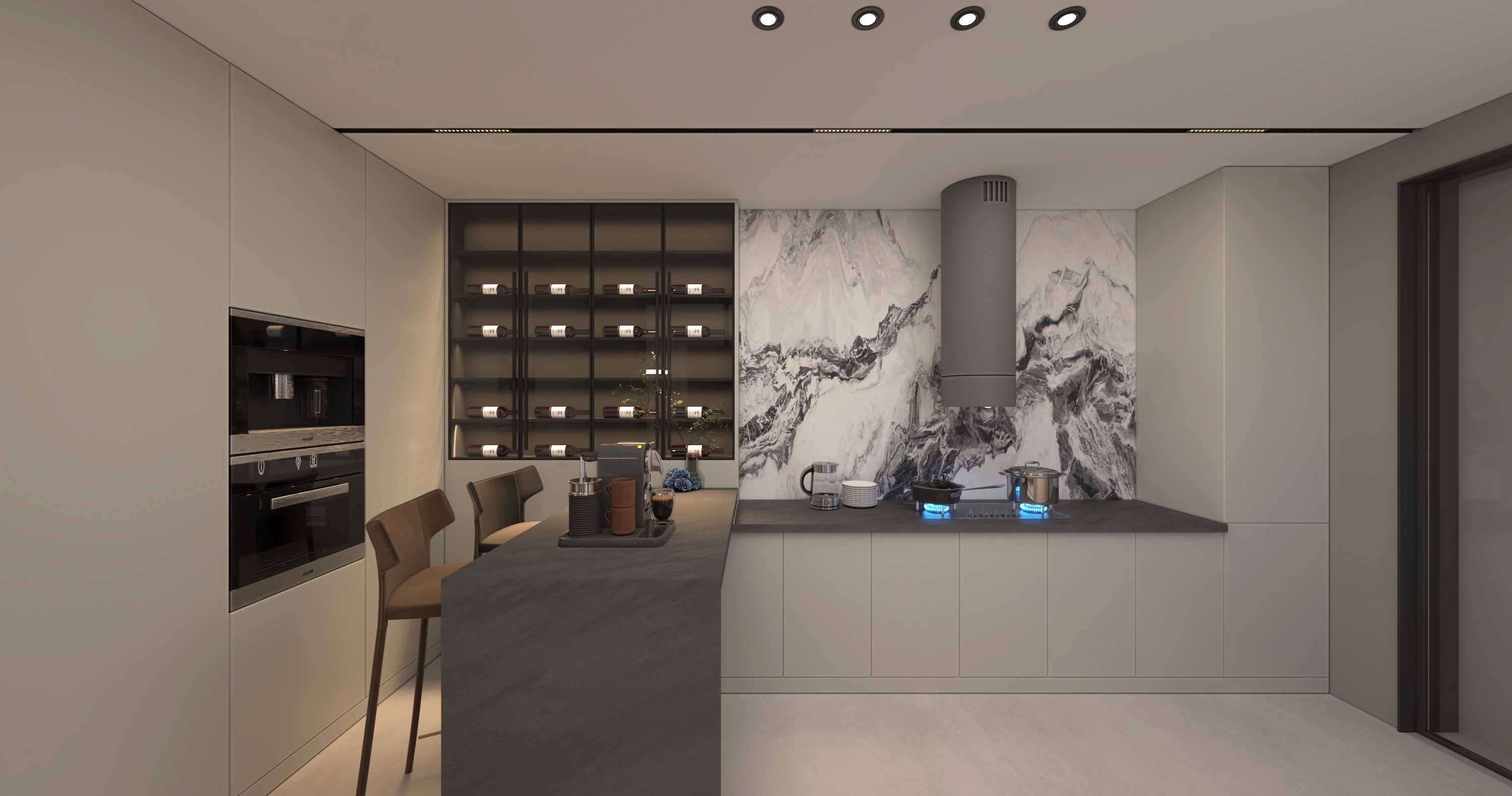 灰调的负压柜门,在大理石纹地砖的烘托下,使精致感延续到了厨房空间,同时还增添了一种前卫的调性。