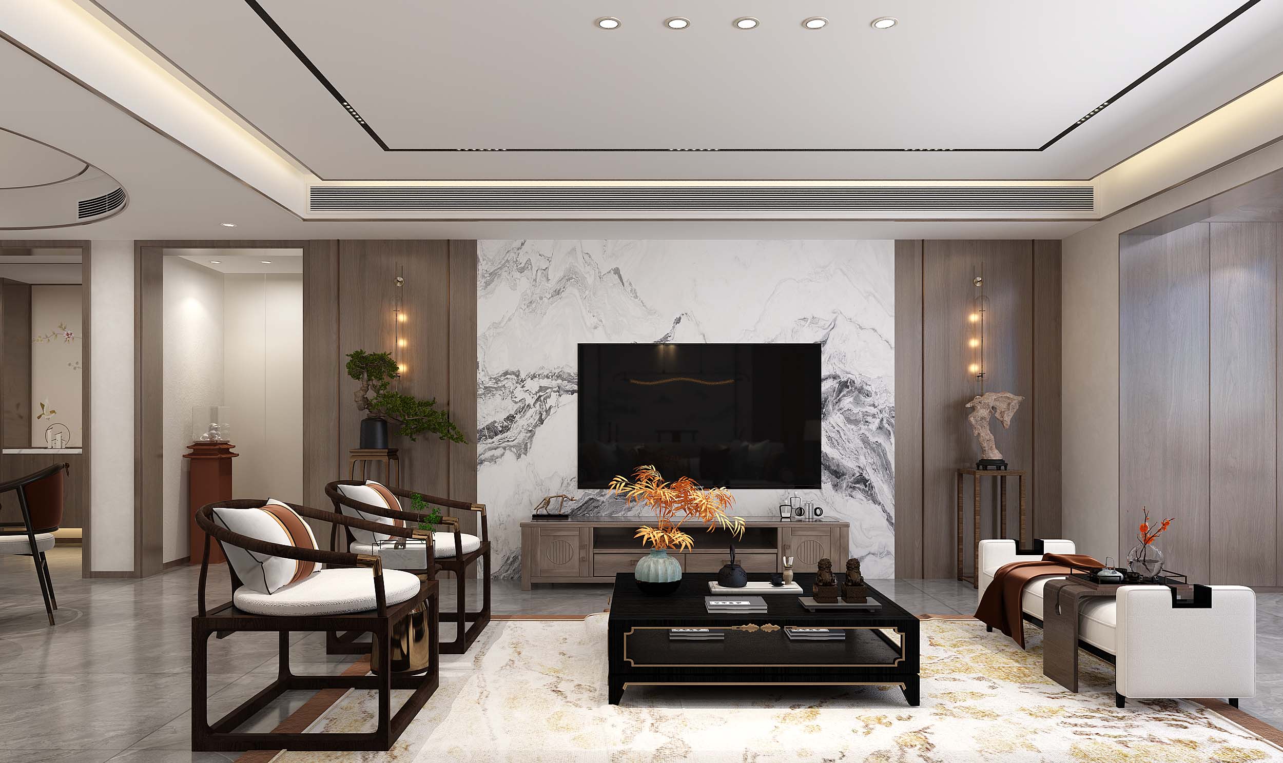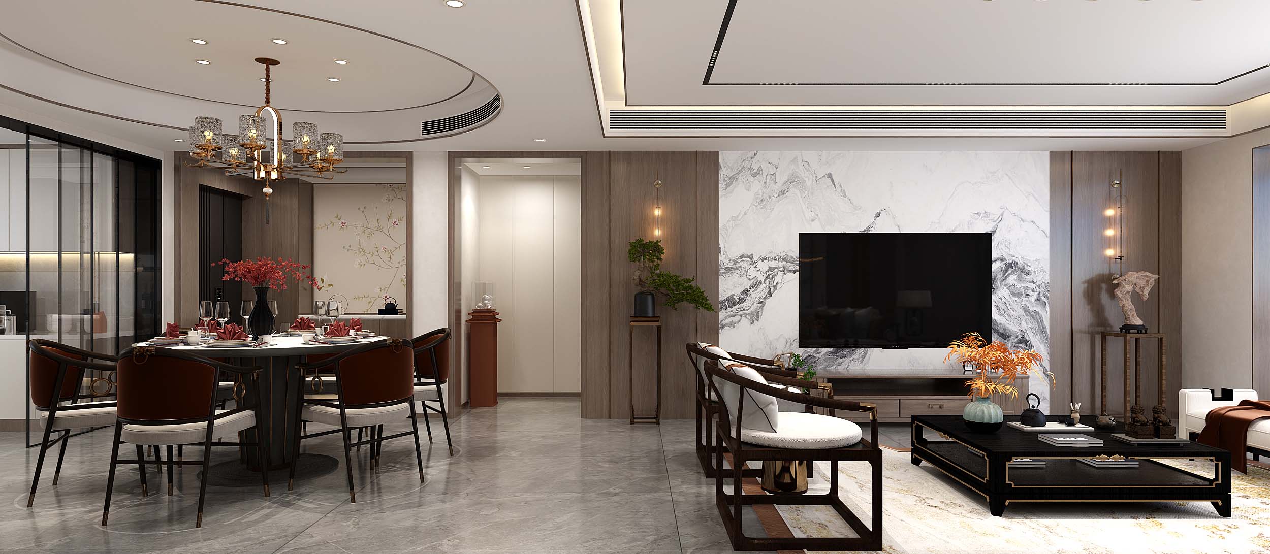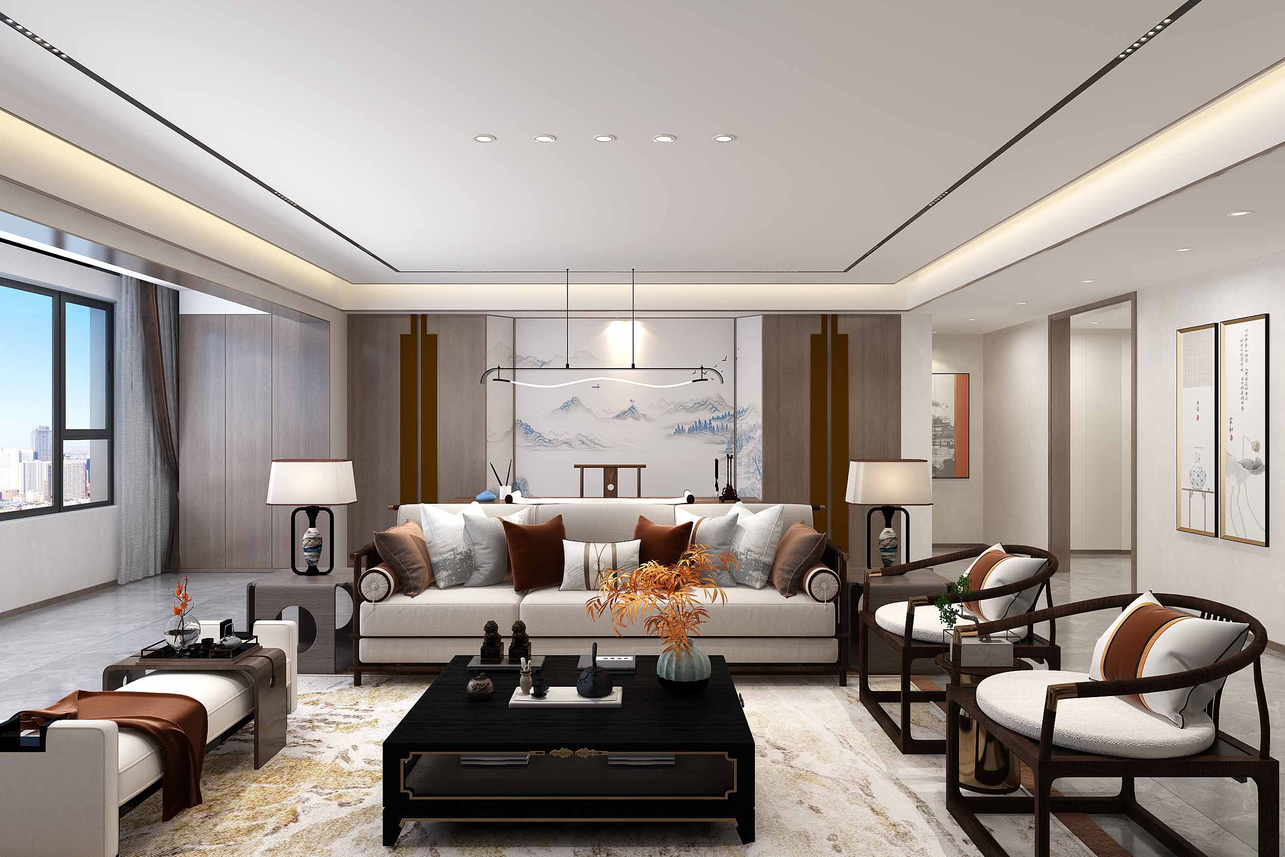 本案,删繁就简,融合东方古典美学与现代新文化元素,展现了新中式独有的文化神韵以及现代简约的优雅。