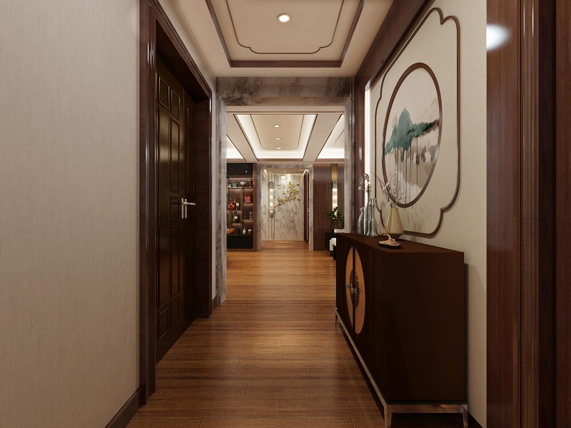 门厅的水彩荷,荷在我们中国的寓意是出淤泥而不染,理解为我们都要保留自己的初终与那份纯真。细语流年浅唱岁月,将天然的木饰面、燕尾弧线、腊梅花等将这些中式元素装饰于家中,只愿寻一片嫣然,将美好的一切都凝固在这里……