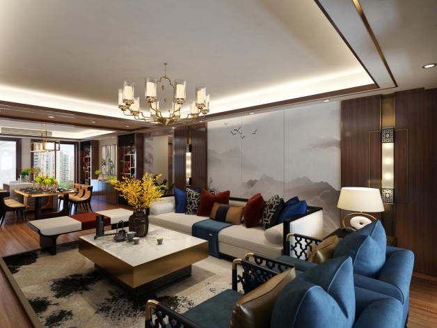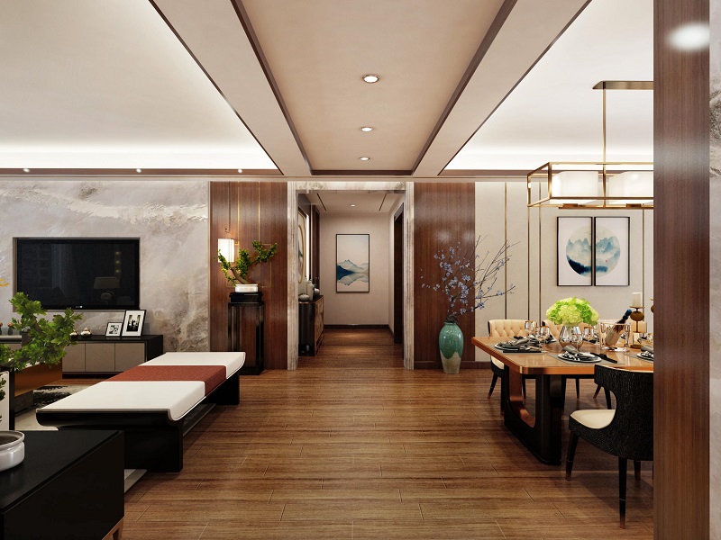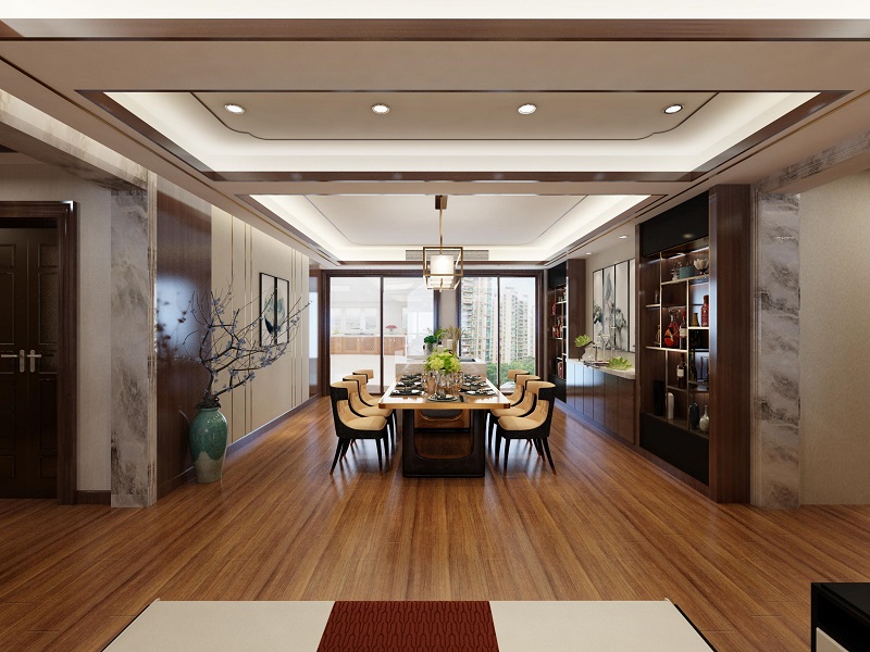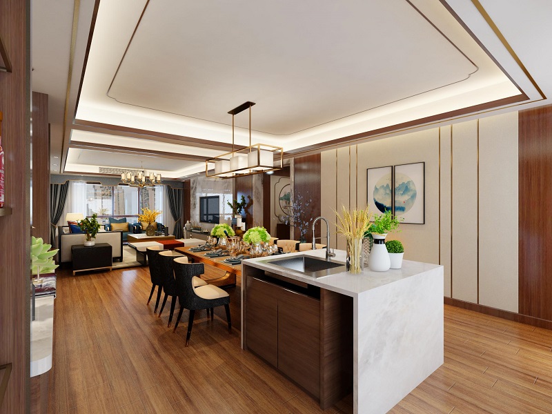 餐厅装饰酒柜、青山挂画、极具视觉冲击力的中岛、有那一抹翠绿,它运用中式的的造型元素又以开放式的活动空间展现,其实在当下的社会中大人们的工作压力,孩子的学习压力,被排的满满当当。有时候我们会问时间去哪里了,那就让我们在有限的时间陪陪家人和孩子,敞开式的空间设计会不会给你带来不一样的生活体验呢?