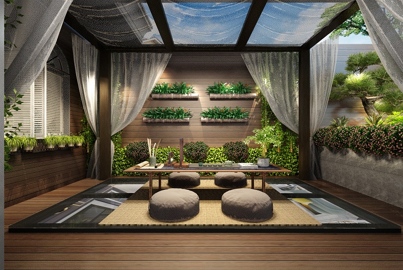 深蓝与原木色相撞,浪漫之余别具性格,在空间一直延伸。