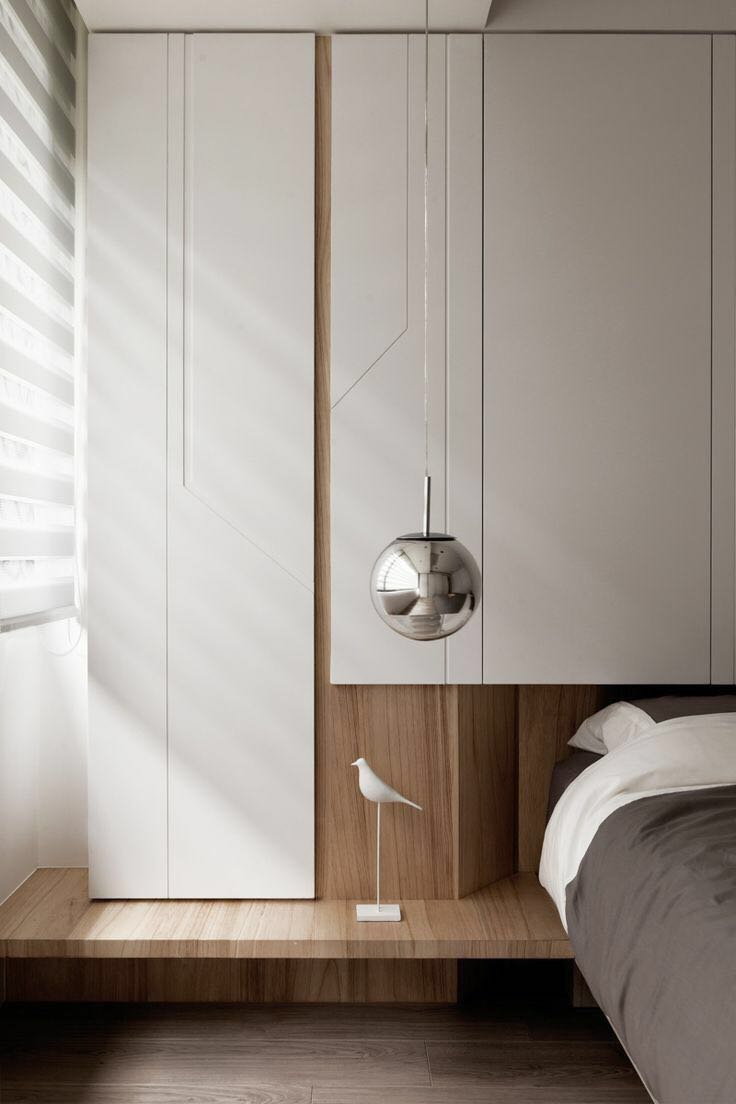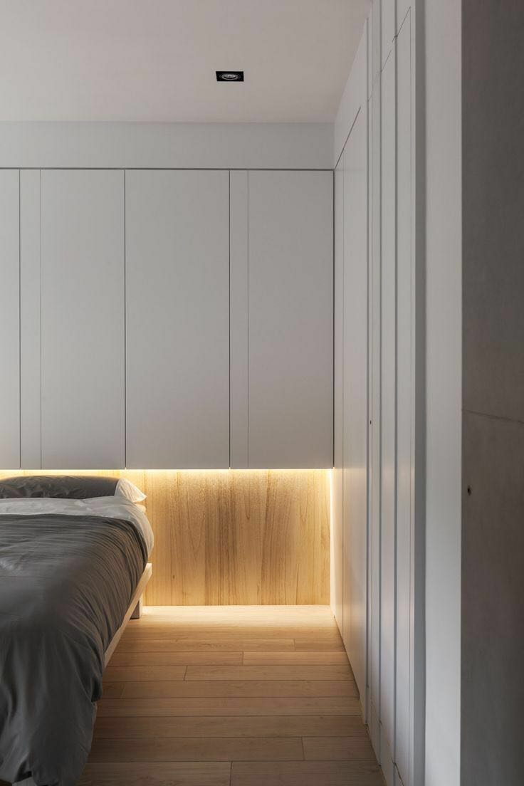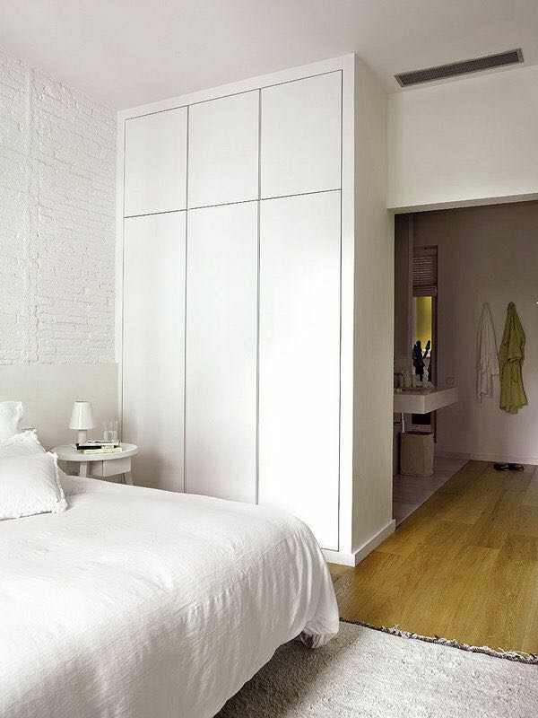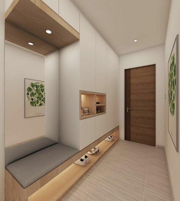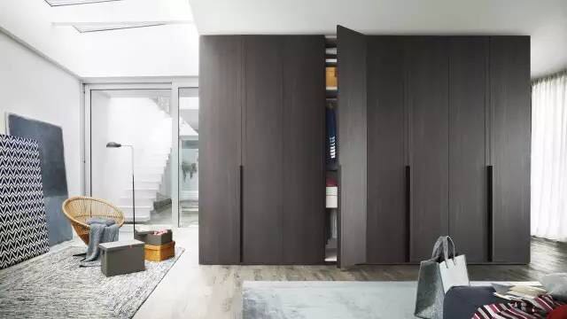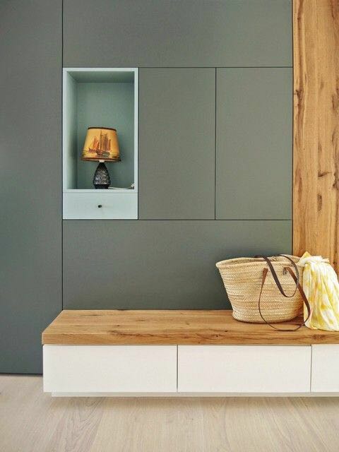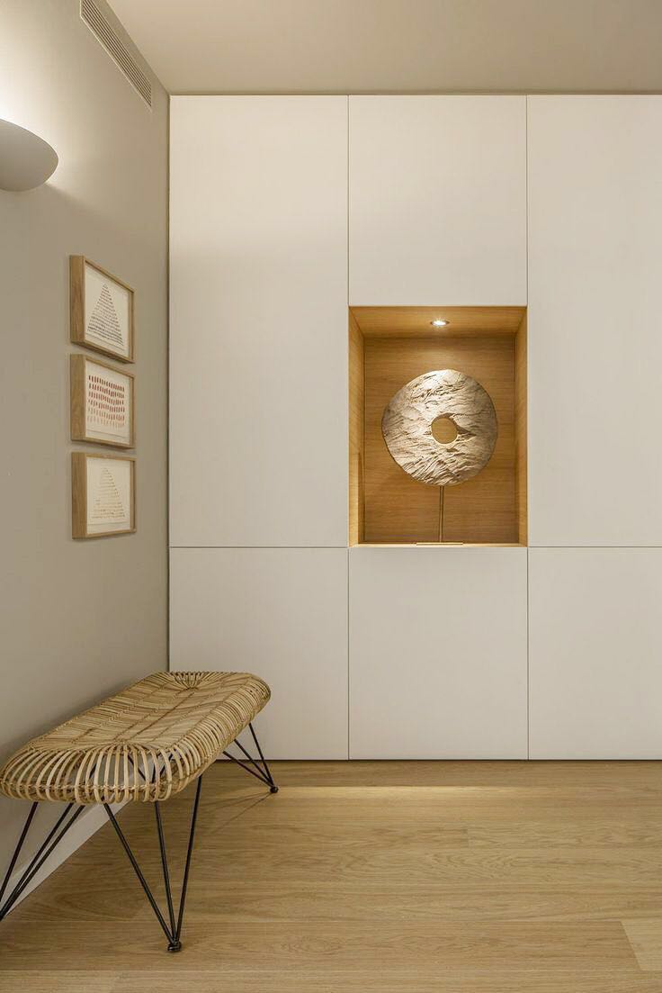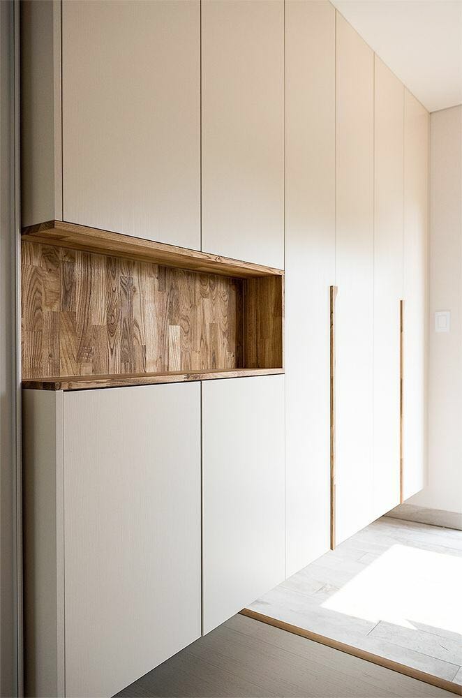 顶天立地的嵌入式柜子,因为没有把手,会在视觉上给人一种融于墙面的错觉,无形中增强了入户空间的整体感。