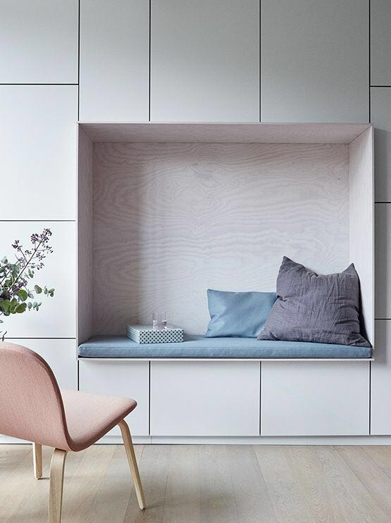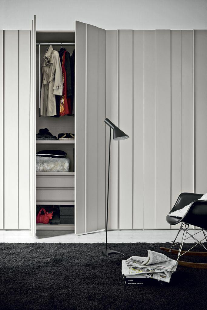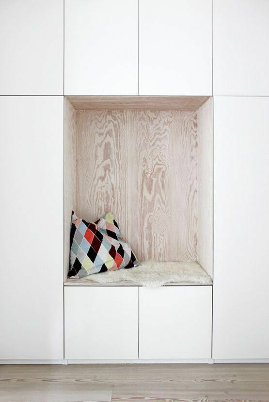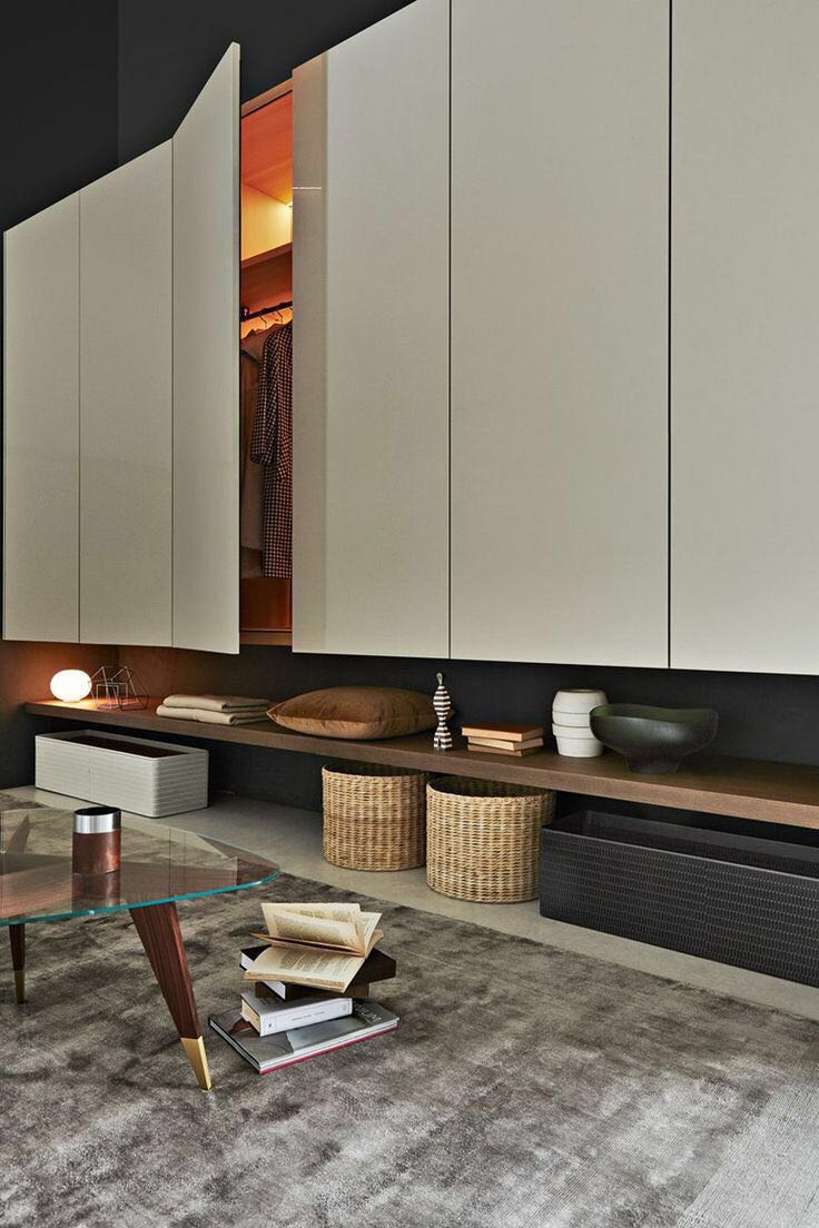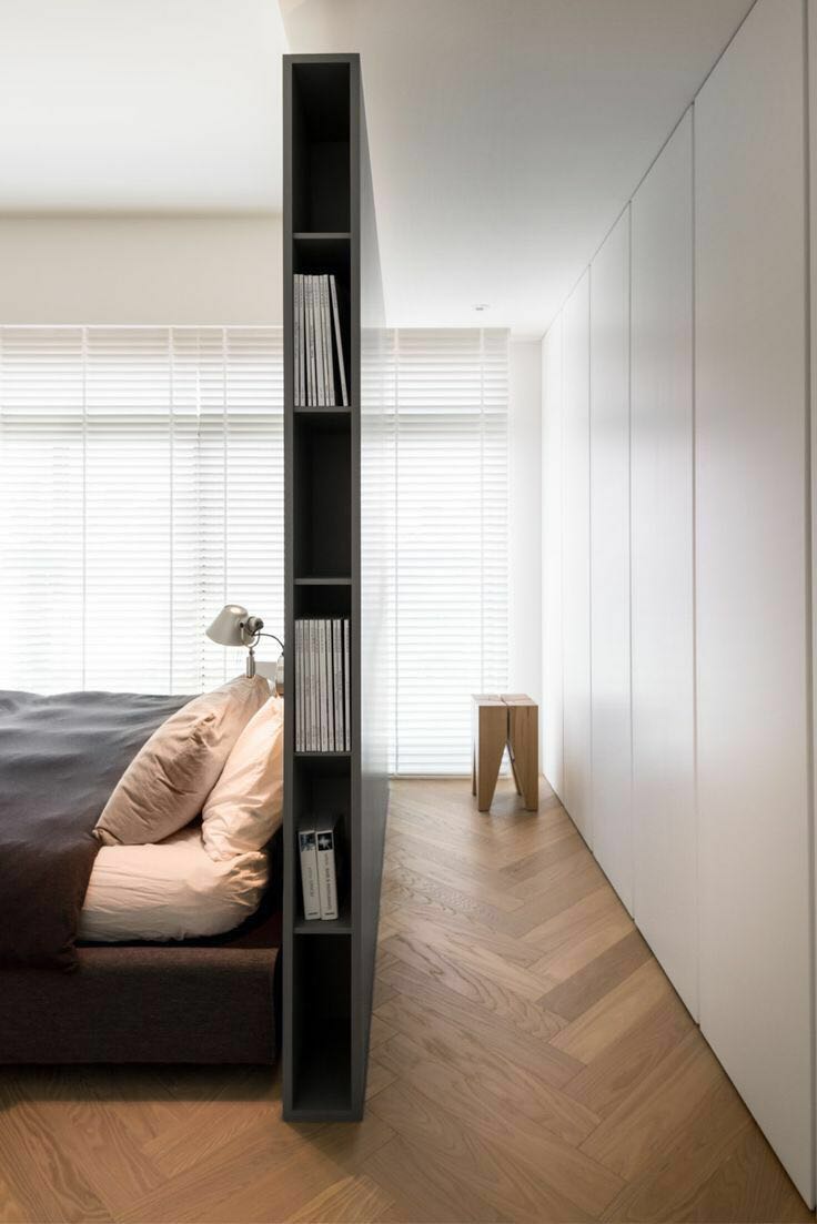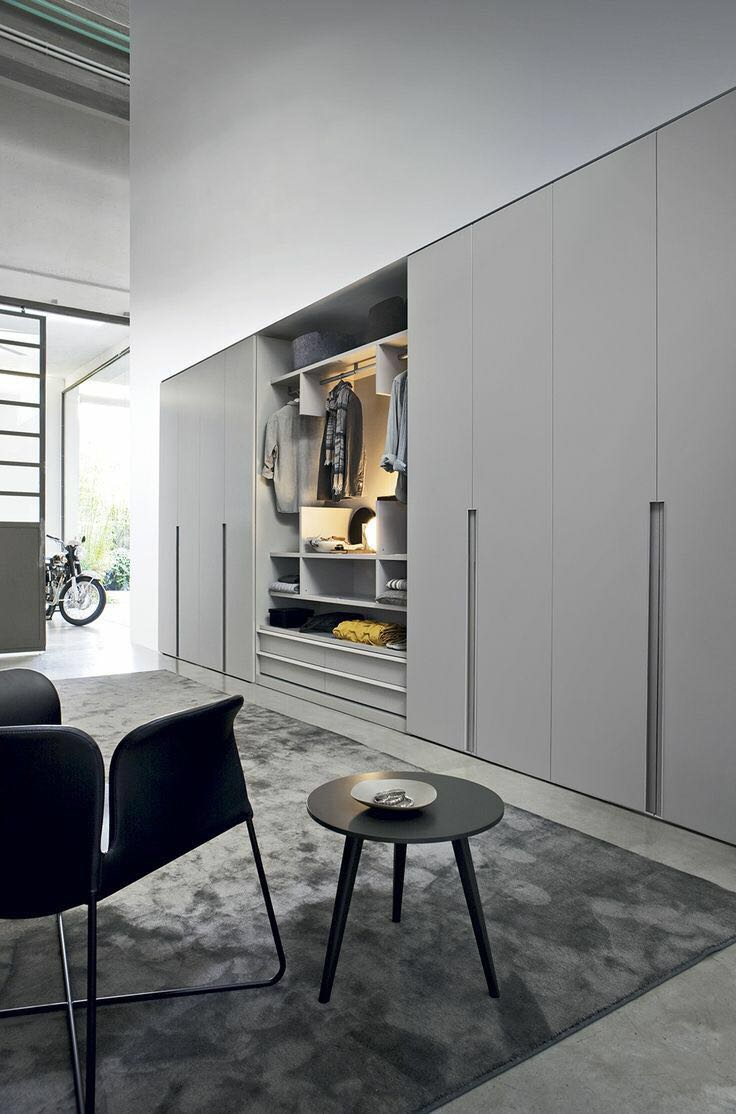 顶天立地的嵌入式柜子,因为没有把手,会在视觉上给人一种融于墙面的错觉,无形中增强了入户空间的整体感。