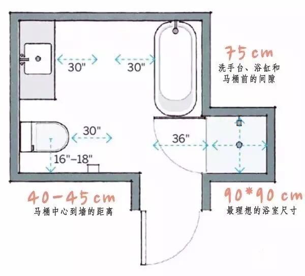 ①洗漱台、浴缸和马桶前:至少空开300mm;