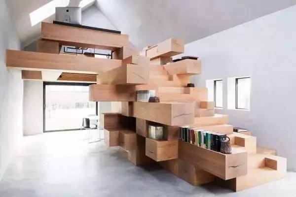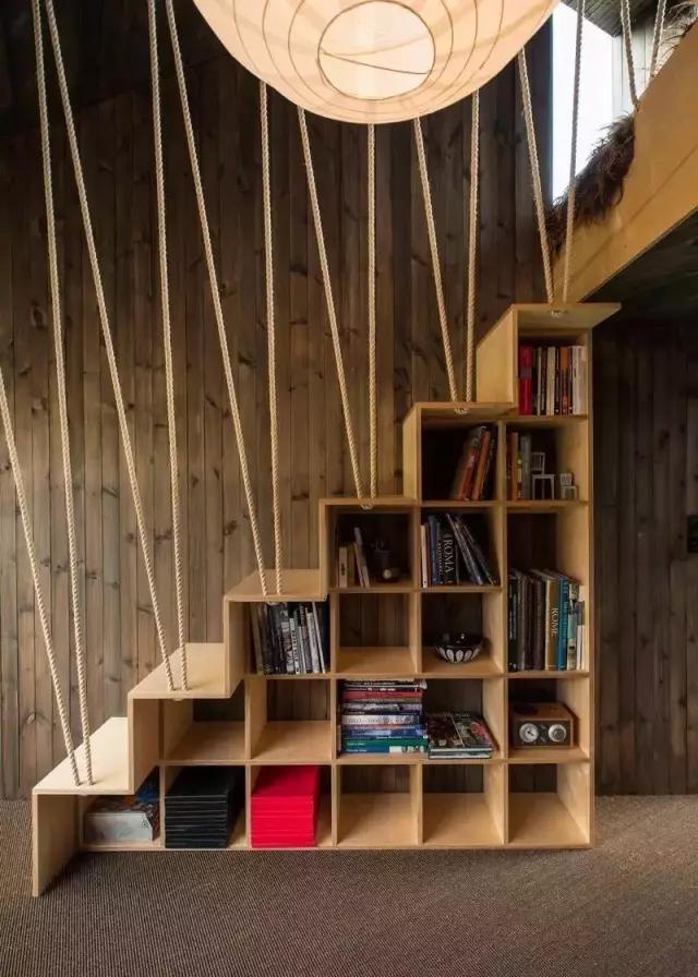 不同木格子踏板之下,就是藏书之地,楼梯功能更加多元化。