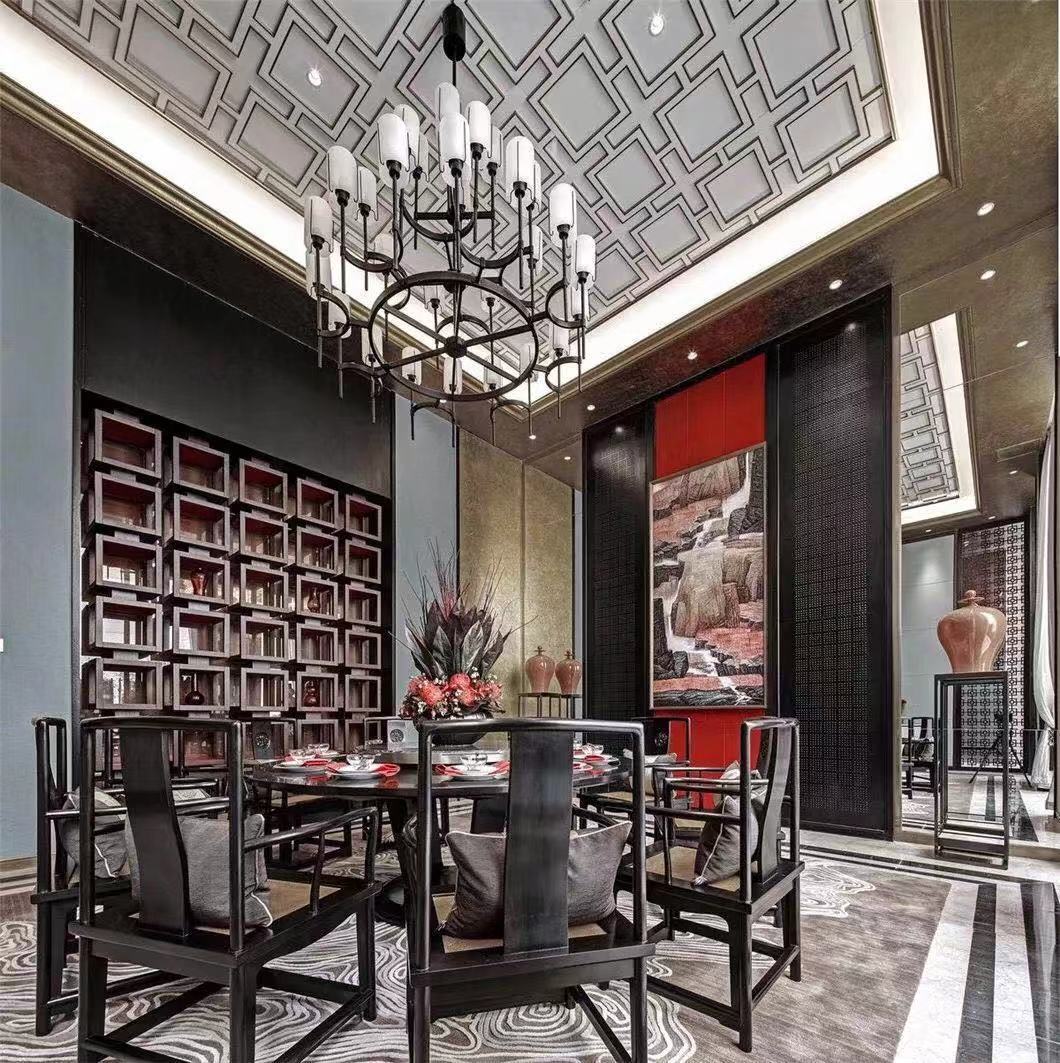 中餐厅的设计借鉴了中国传统建筑艺术,巧妙地融入现代简约型制。回形纹的古典框格装点天花,圆桌餐椅排列严谨有序,端庄的方与大气的圆,整体