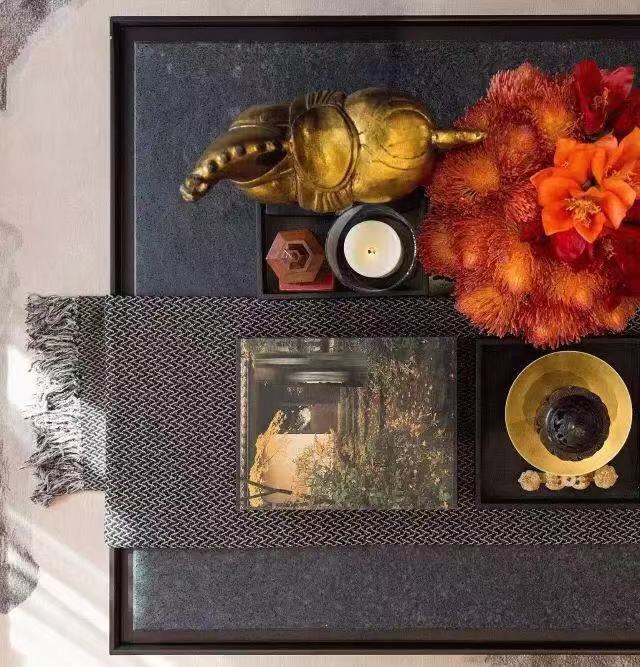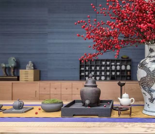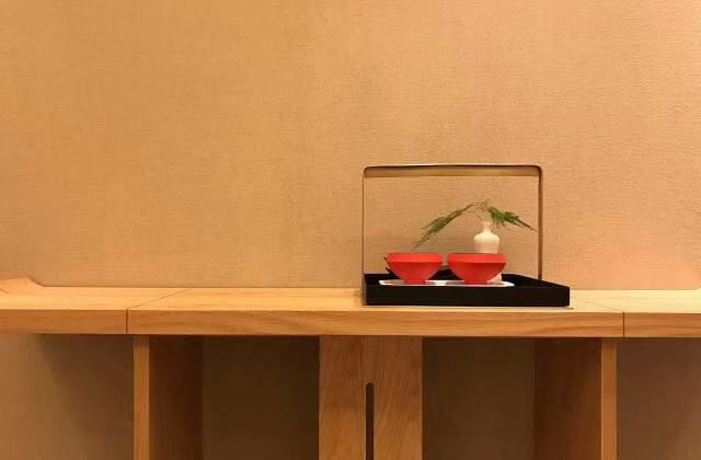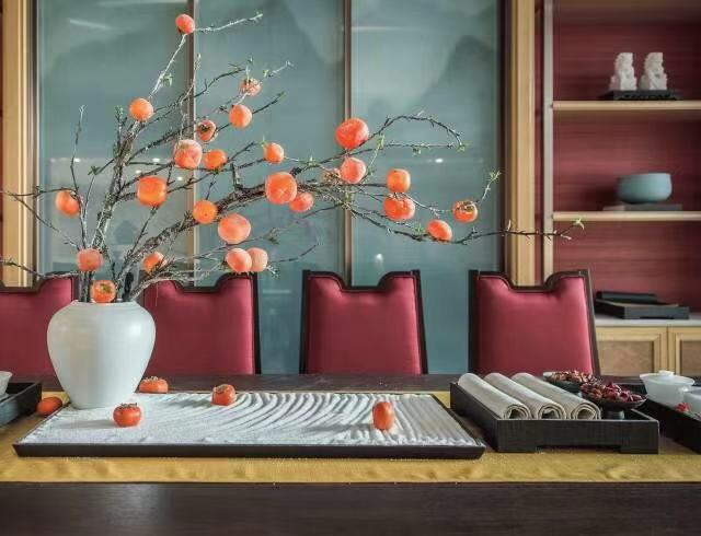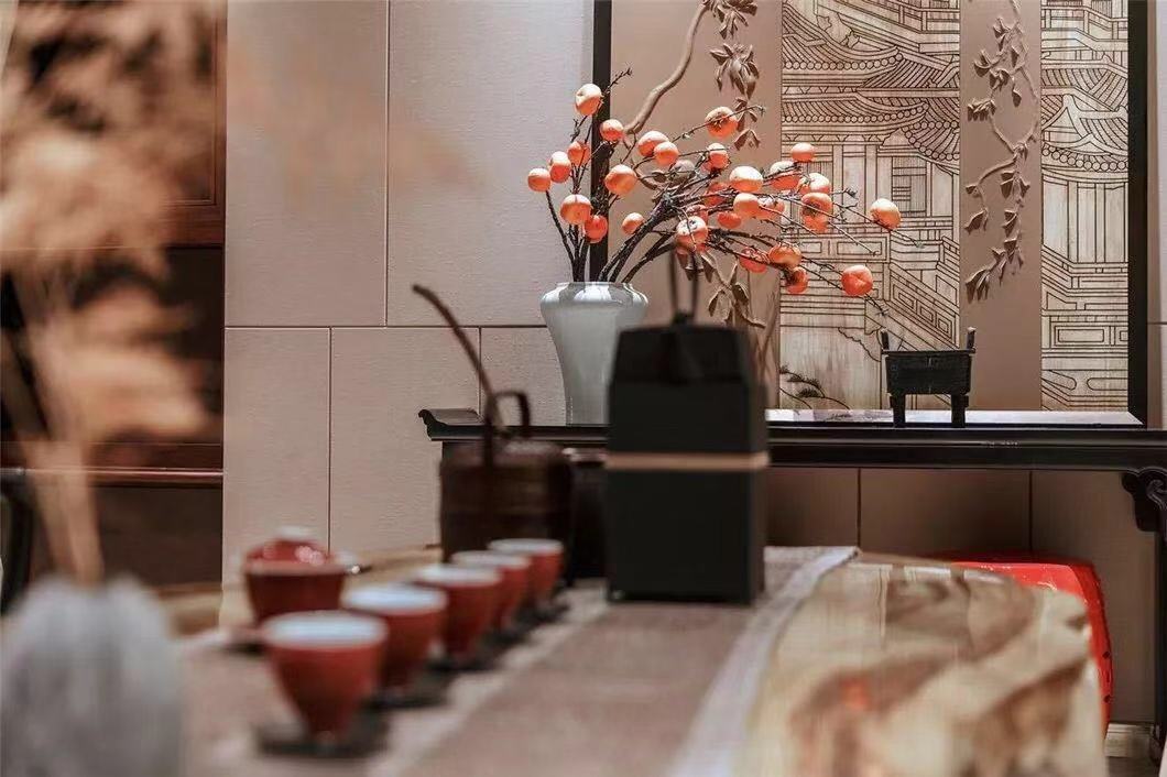 茶道的古韵古香透露着恬淡优雅的生活氛围。脱叶已疏,几株熟透的柿果压枝;雕花柔美,更显木版画上楼阁的刚劲肃穆,折射出设计对传统合院式空间