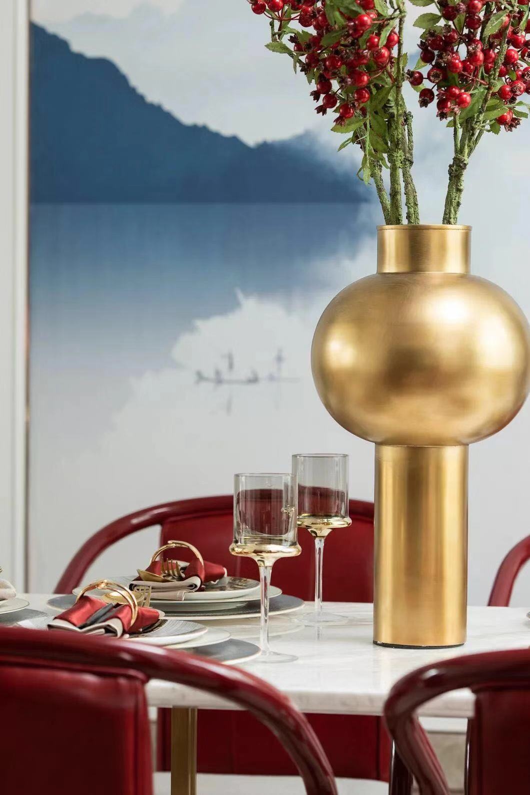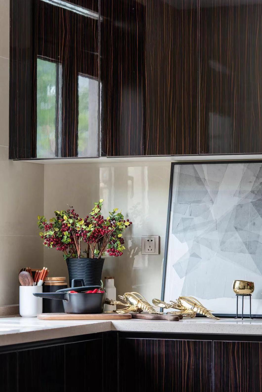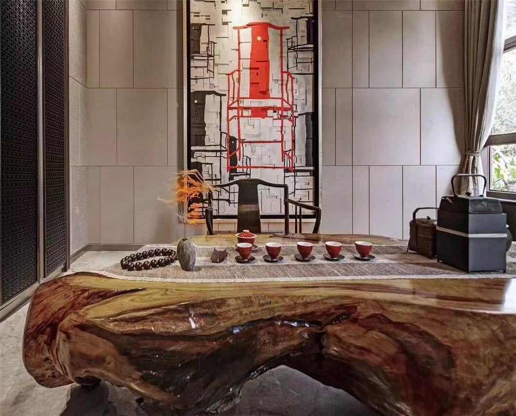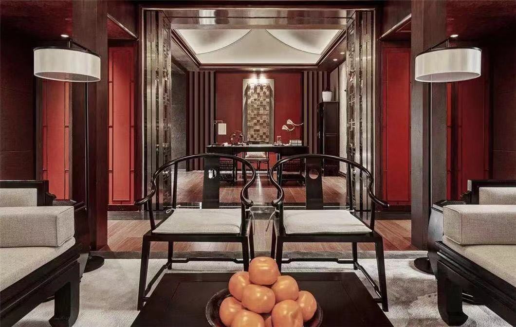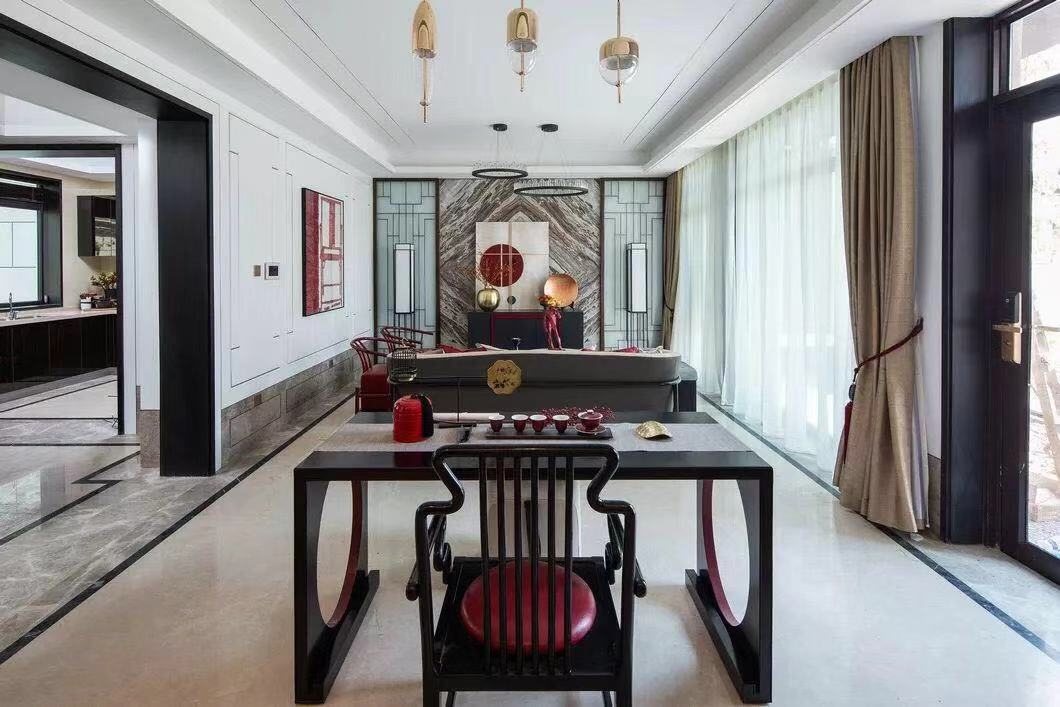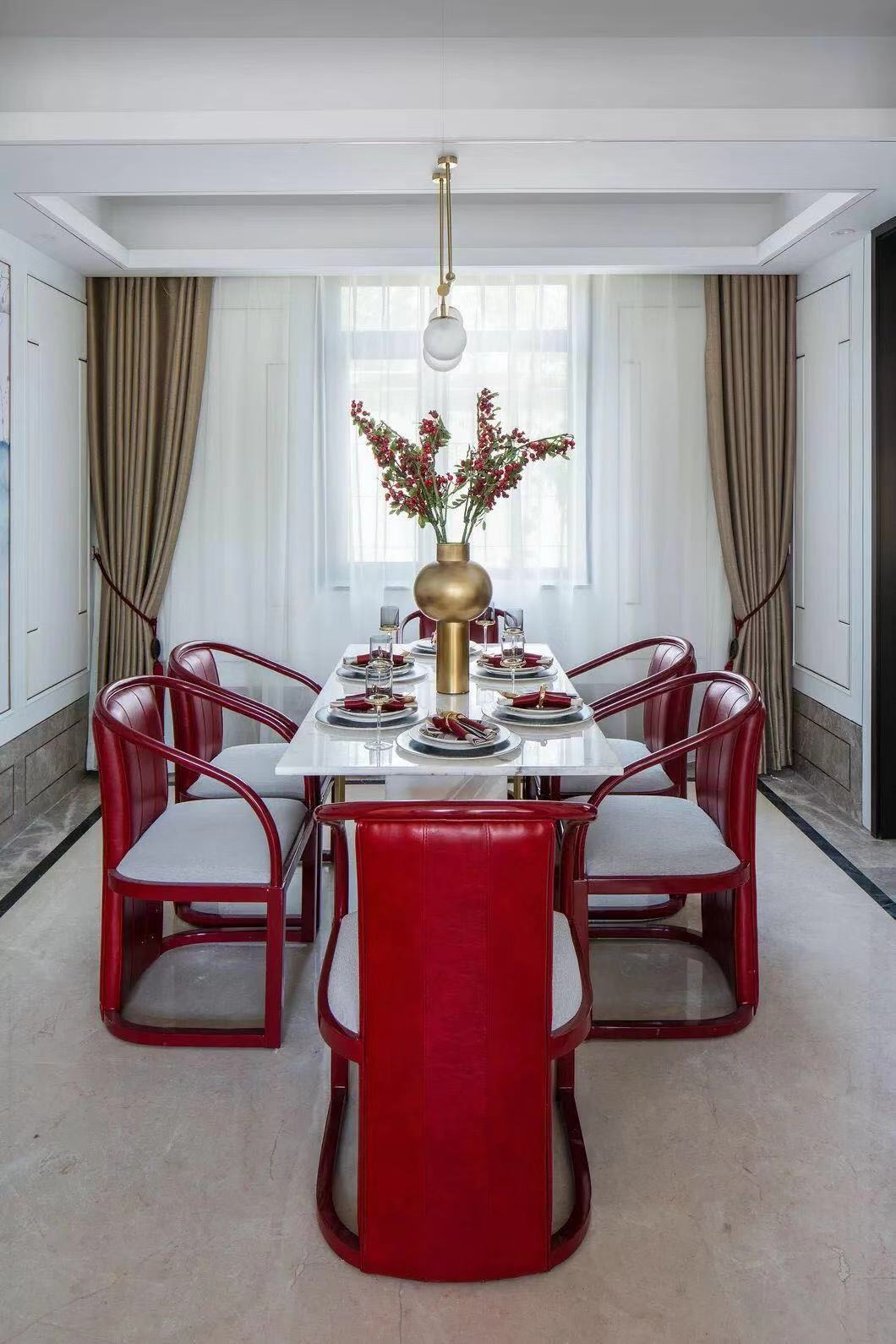 中式玫瑰椅简洁朴拙,实木长桌充盈着古朴健实的气息,空间处处渗透着旧时文化意蕴,折射出古代人们师法自然、追求安定和谐的文化意识和哲学思想。