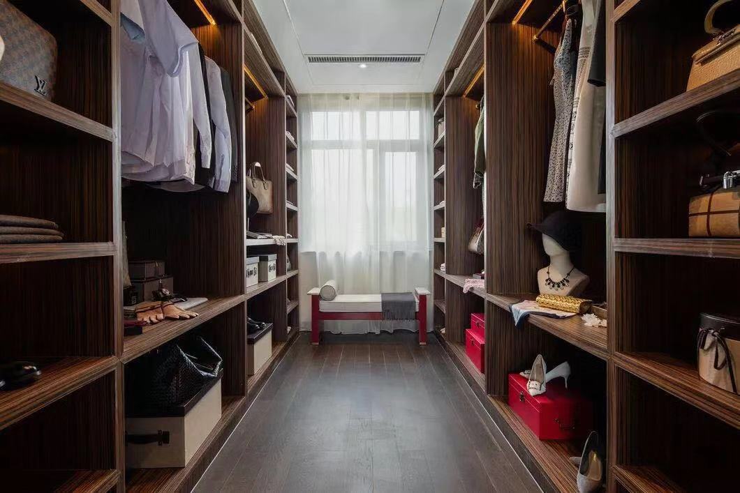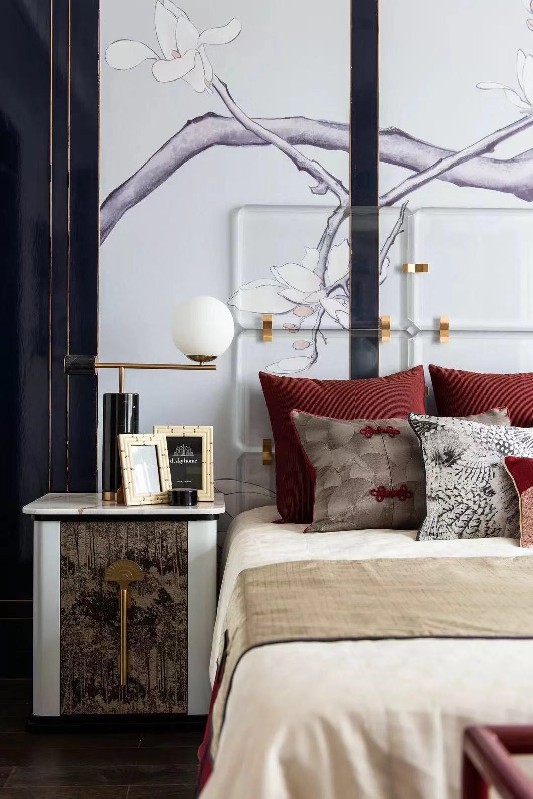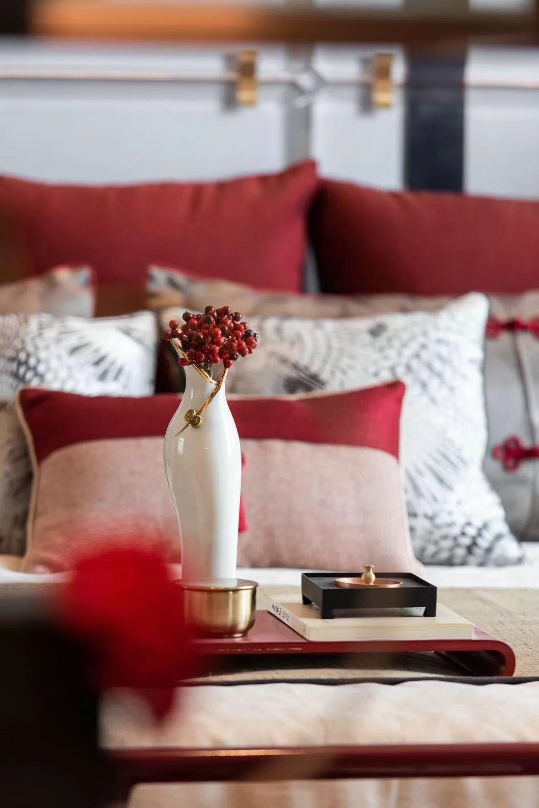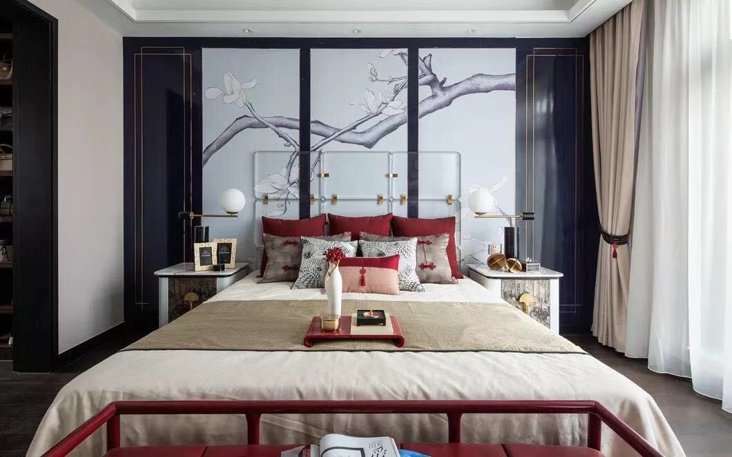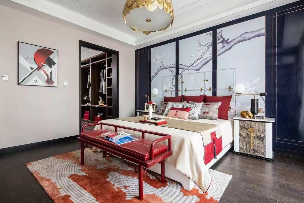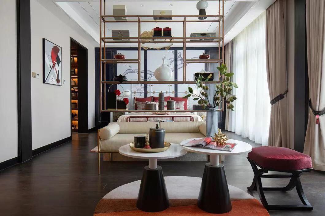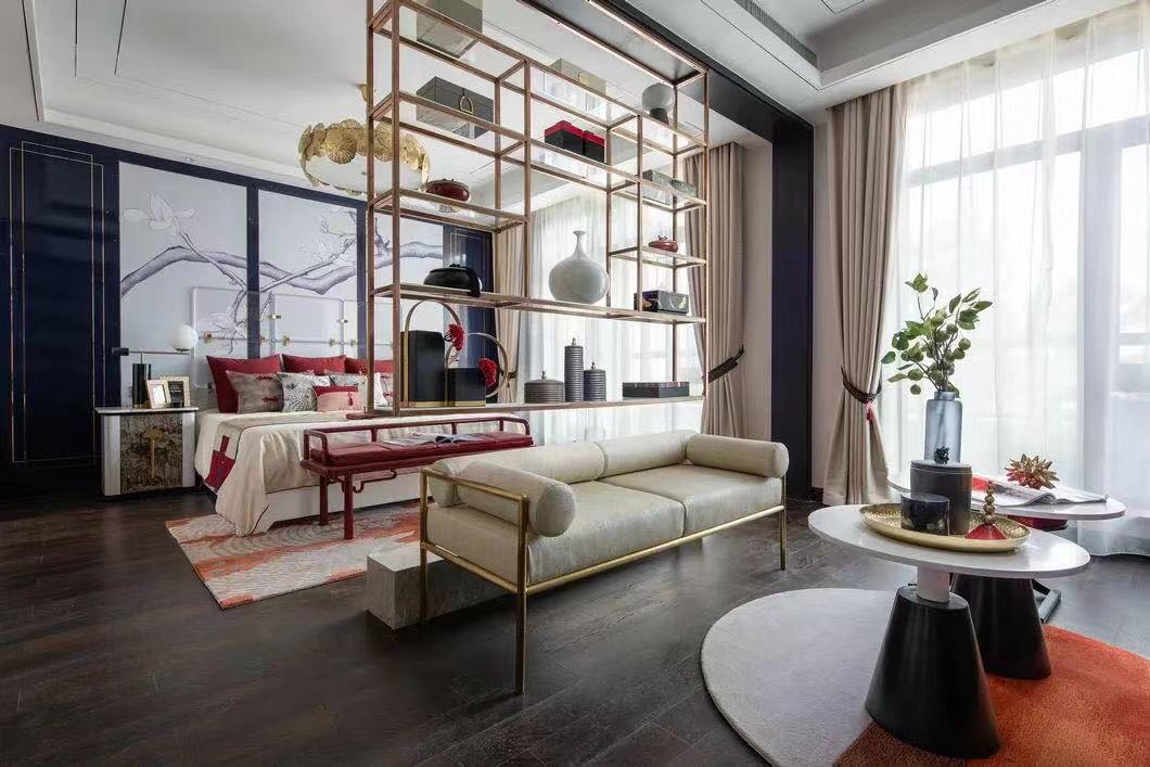 挑高的屋宇、两侧全明落地门窗的设计,引入大量自然光线与气韵。整齐光洁的屋梁,精致大气的柜体,旧时中式床榻椅具,针脚细腻的丝质床品,再现