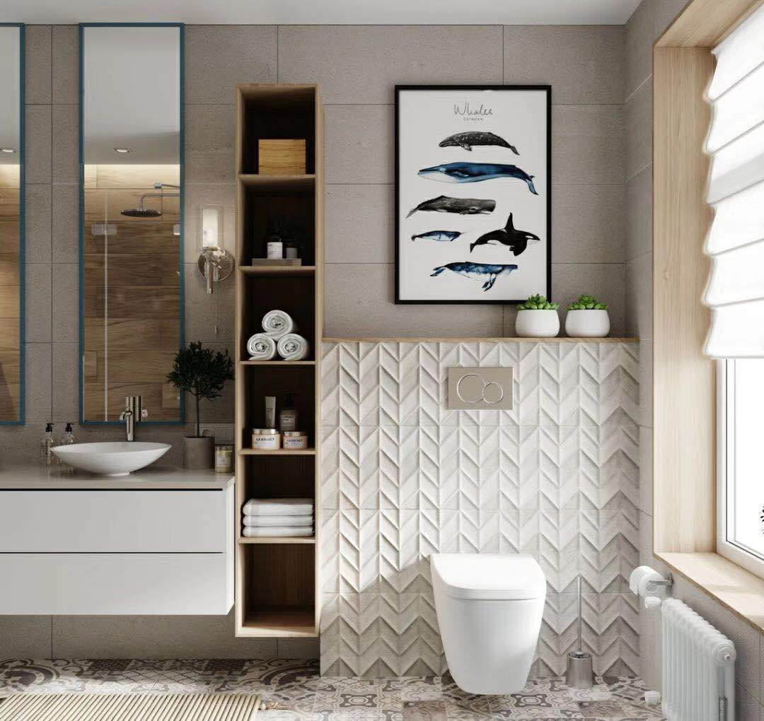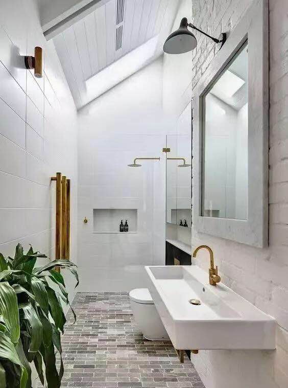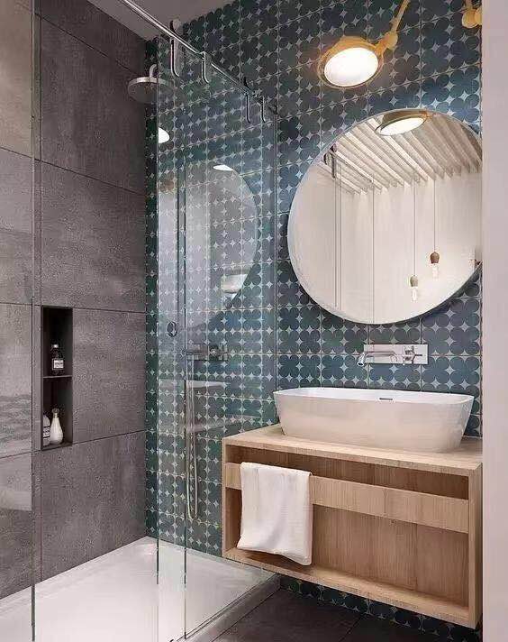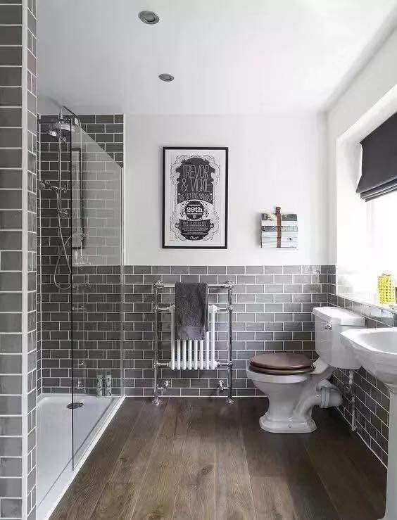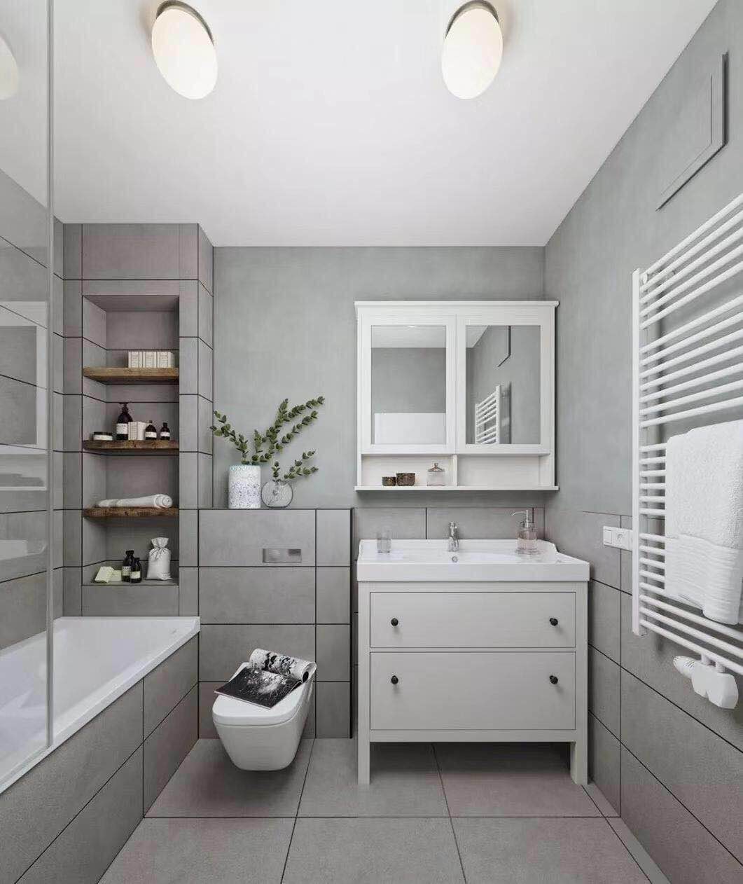 如果你不是白色的粉丝,可以通过温暖的米色,柔和的灰色甚至粉色系(粉蓝、粉红等)来营造空间的宽阔感。选择一款品位高雅的瓷砖