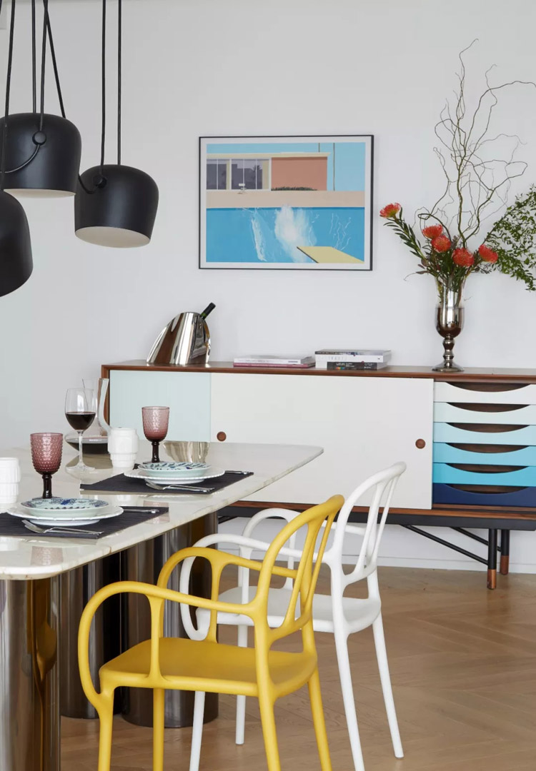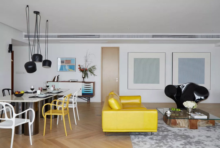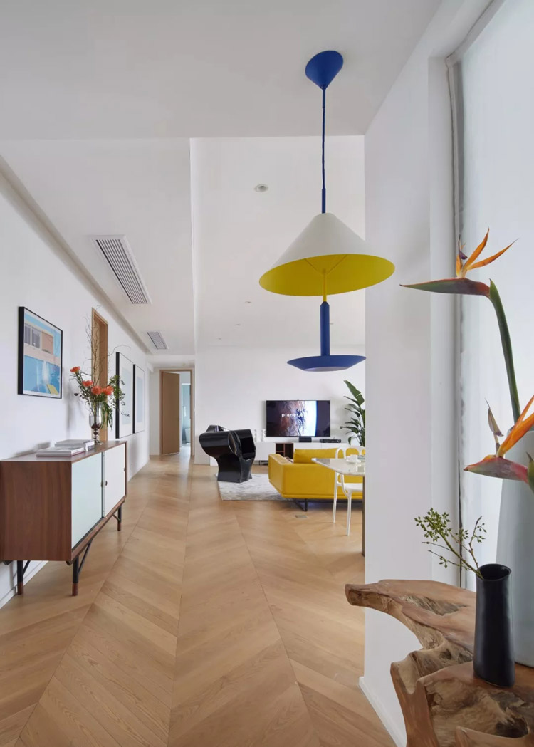 设计师决定将空间“退着做”把更多的可能性留给软装和业主,空间以留白为主,硬装在固定家具上实现了很多技术上不可能的创意,柜体的四面悬空,满足了极简的美观及实用性,而整体空间没有风格只谈,融入的更多的是居住者的生活痕迹。