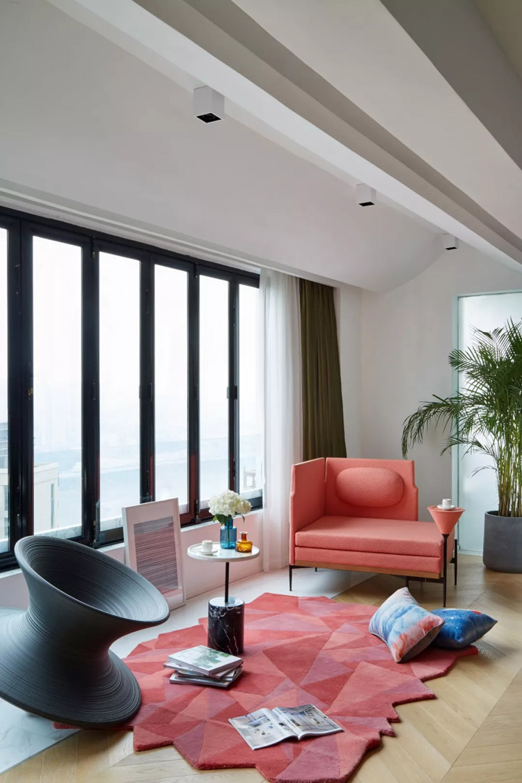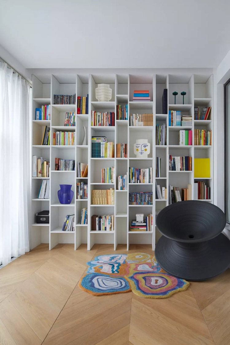 活动空间,是家人与孩子交流的重要空间,因此整个空间格局被设计师打开,不论是客餐厅,或者休闲区域或者阳台都得到了很好的释放,当小朋友身处活动区域时,不规则的书柜,360度旋转的陀螺椅以及缤纷世界的地毯带给她们的是好奇与自由,无拘无束开发他们无限的可能性。