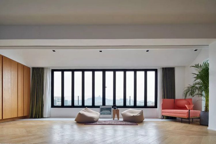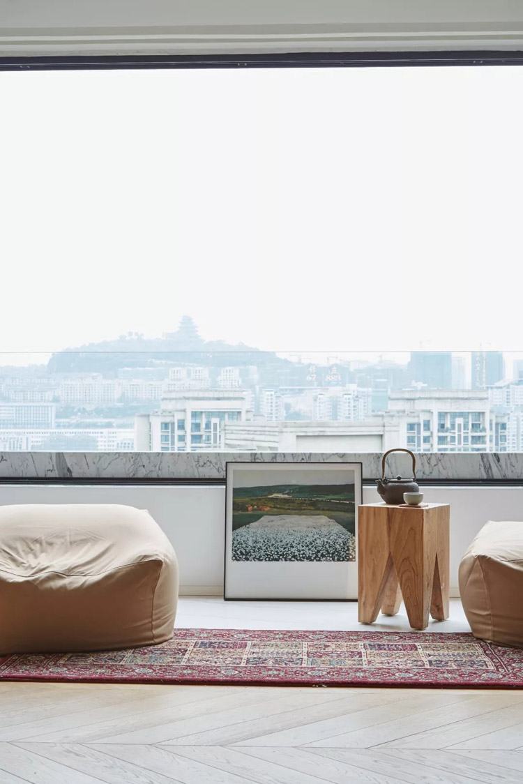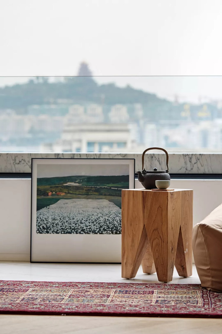 设计师将原本的雕花栏杆全部拆掉,更换成无边的通透玻璃,让空间得到了最好的阳光与风景,同时又安装了可折叠型的窗户,保证小朋友的安全性,这样惬意的生活,便是一杯淡茶修心养性,所有的疲惫仿佛被顷刻卸下。