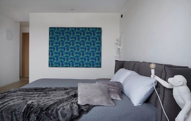 卧室以灰色为主调呈现安静雅致的氛围,墙上的装饰画出自设计师原创,环环相扣的图案及seletti猴子灯,给宁静的空间多了一丝灵动的情调。