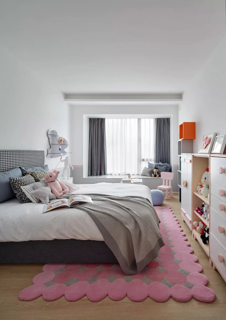 儿童房则以淡灰色配粉色,粉嫩而有生命力,低矮的开放式柜体设计,可以让小朋友养成收纳的好习惯,设计师将小朋友婴儿时的衣服,用于再创新,做成了装饰画,放置在房间中,增添了空间的生活气息,也延续了居住者的成长回忆 。
