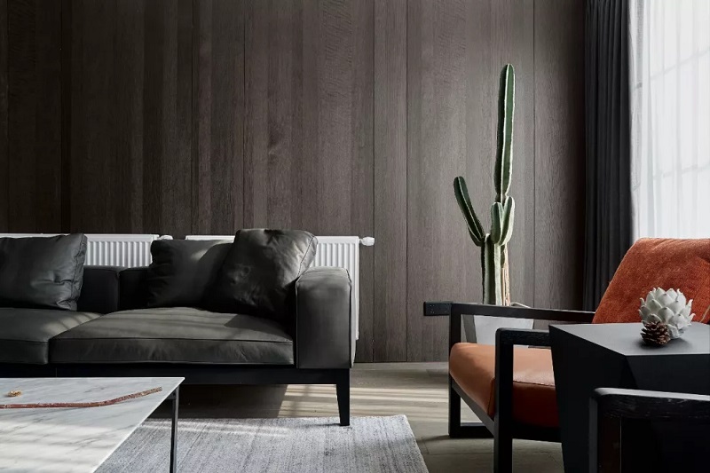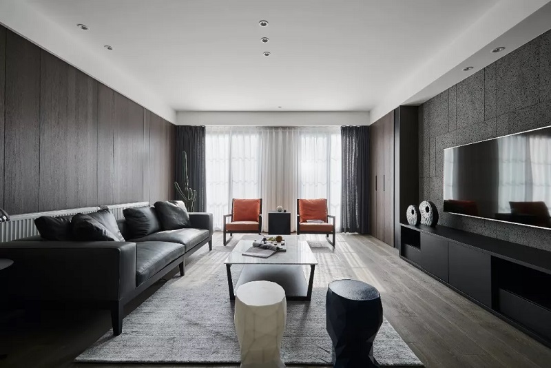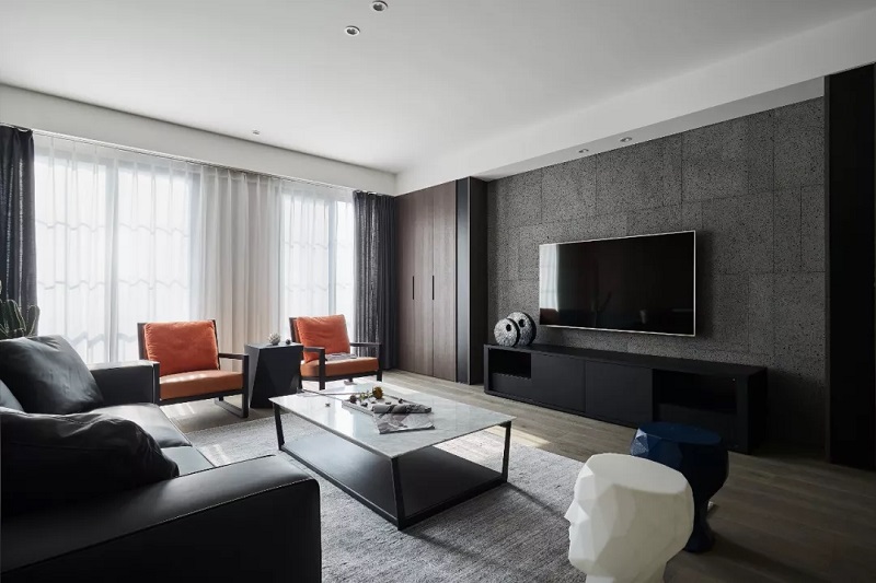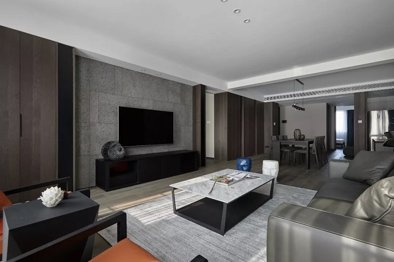 精确的设计语言及利落的表现手法诠释了这套现代作品,空间调性大气稳重,每面墙面所涉及的材质都是从地面直通到顶面, 包括灰洞石、胡桃木、钢板等,并通过材质原有的肌理、质感及色彩,来丰富空间视觉的层次变化,局部选用了橘、蓝来点亮空间,并细腻地刻画了空间私隐和宁静。