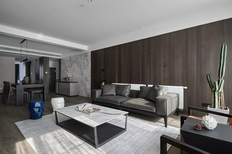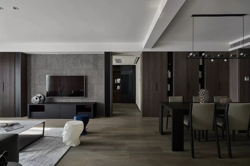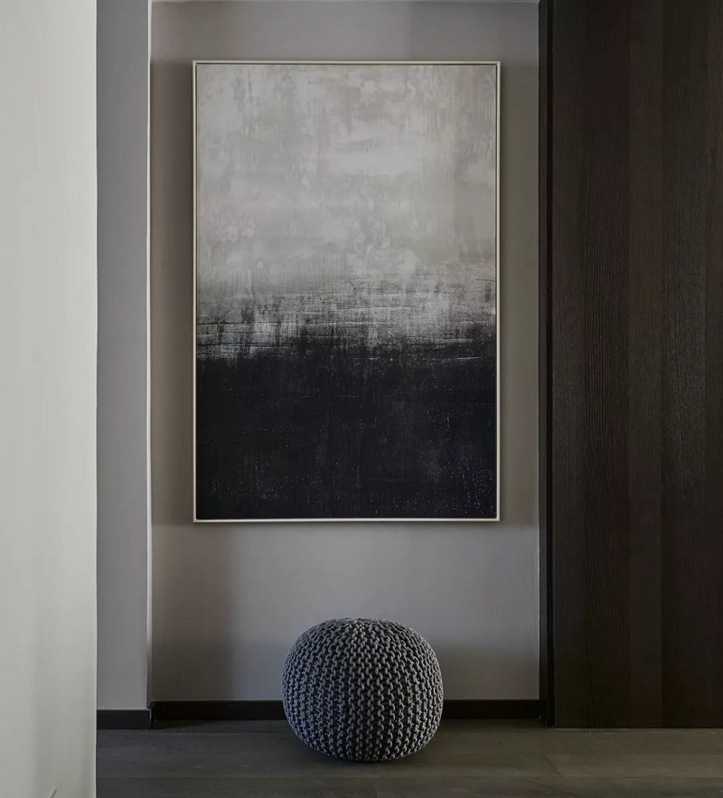 原户型结构,入户门对门的设计,对室内风水来说是一个大忌,所以,我们在过道尽头处设计了一面玄关景,大面积的浅灰色背景结合沉稳的胡桃木色,黑白灰过渡的肌理画成为入户空间的焦点,使得原本简洁干净的室内空间,瞬间与艺术氛围相结合,这样的一个中性配色,呈现出“淡定、内敛、平衡”的柔和美感。