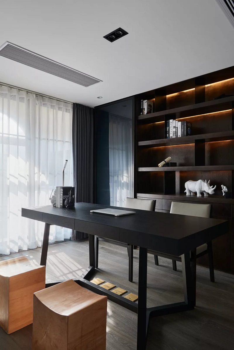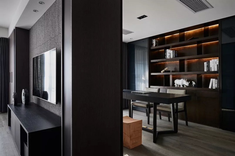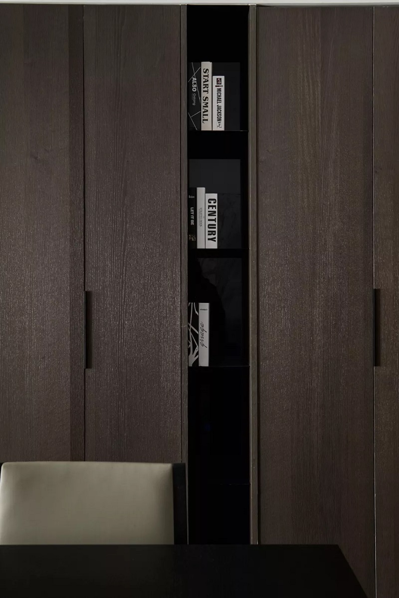 书房承担了屋主阅读、工作及休闲的功能,一面书柜作为背景,每隔层暗藏灯带,使书籍在灯光的折射下,如艺术品般精致,并透过灰色玻璃移门,若隐若现,即使色彩再丰富的书籍封面,也会在这道滤镜下,变得统一,每处细节的设计无不透露出屋主感性与理性的结合,又有着令人寻味的艺术理念。