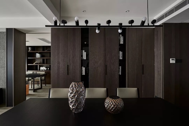 餐厅区域的背景是仓储及美观一体的柜体,半敞开半封闭的形式,每扇对开柜门的比例都是不一样的(一大一小),细节的勾勒,让沉静空间悄悄的流露活泼俏皮的一面。