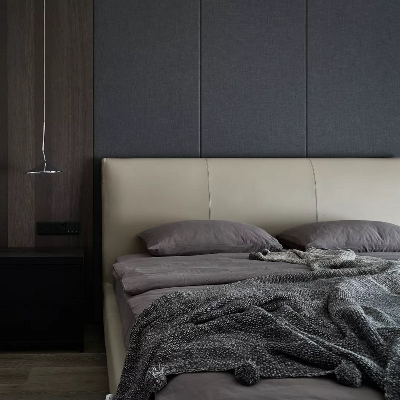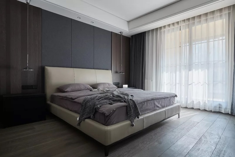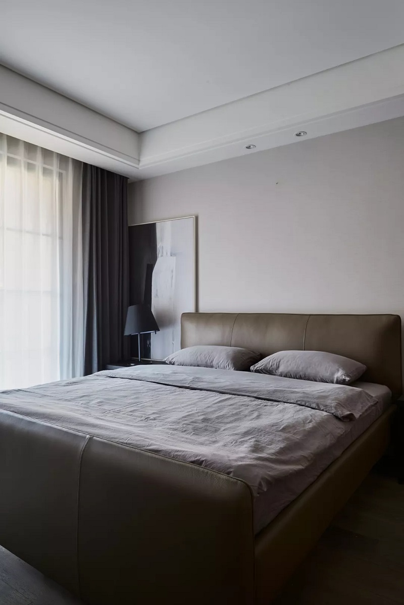 推开主卧的房门,高级灰的主色调与户外空间自然衔接,深灰色硬包背景在咖色木饰面的衬托下,流露生活品质的讲究和精致。每一个闲适的时光里,惬意地躺床上,看温煦阳光懒懒爬进窗子,开始美好的一天。灰调的窗帘和素净的薄纱是优雅风情的最好色彩,空间的干净与温暖的气息,在深与浅的碰撞中造就一个诗意的存在。