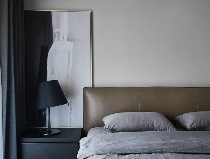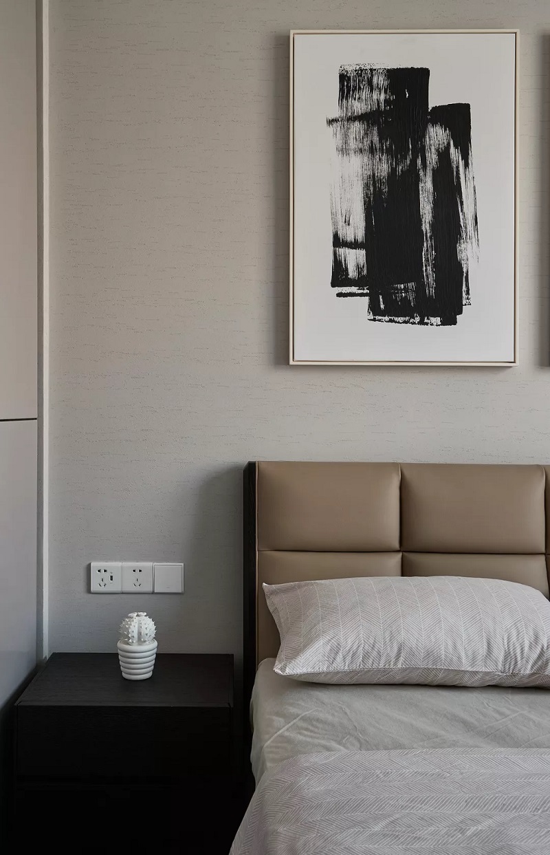 毗邻的次卧温馨舒适,素色肌理墙面设计配上充满墨元素的艺术挂画丰富了空间的视觉效果,每一处经得起推敲和思考的细节设计,才是怡然自得的本性所在。