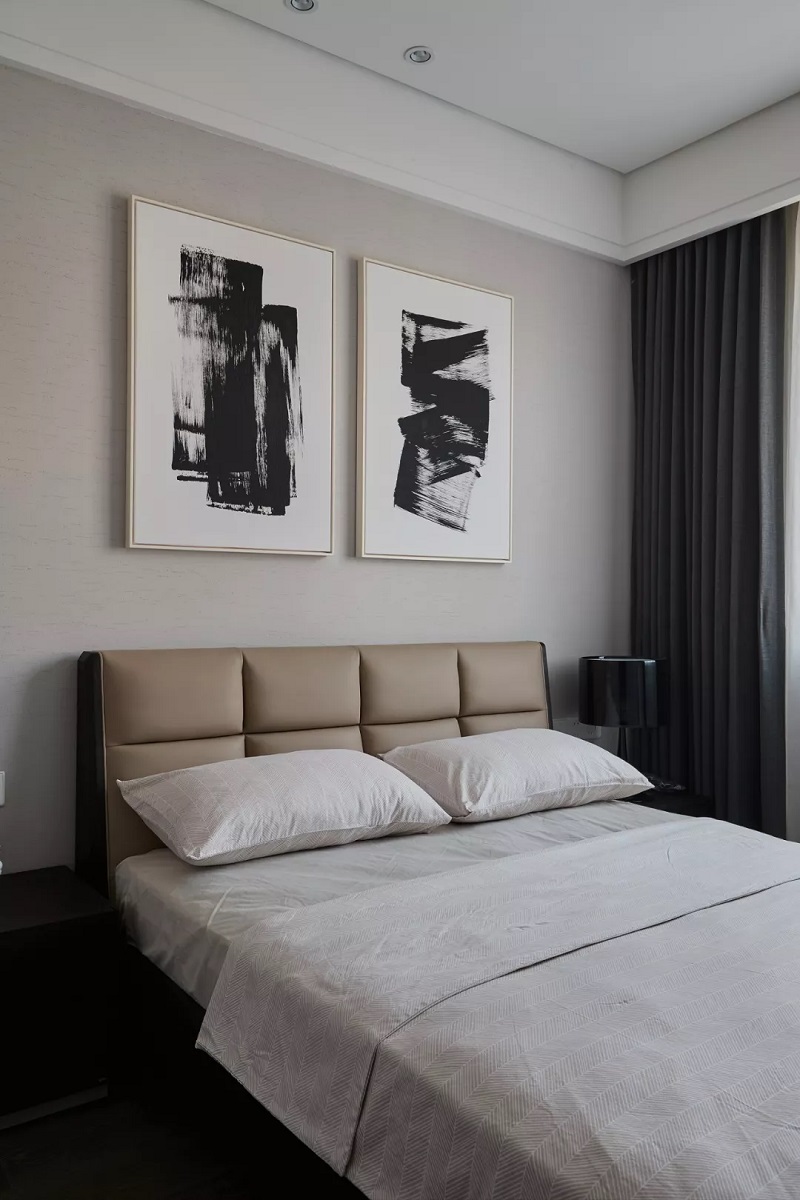 色调温和富有肌理,将冷静客观与清新明丽结合。床头柜处摆放一副黑白灰三色艺术画,卧室的每处细节陈设都将灵动与魅力的格局重新演绎。