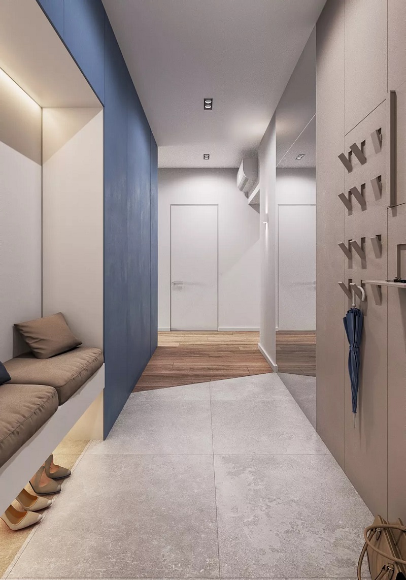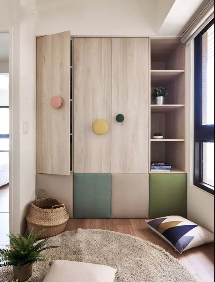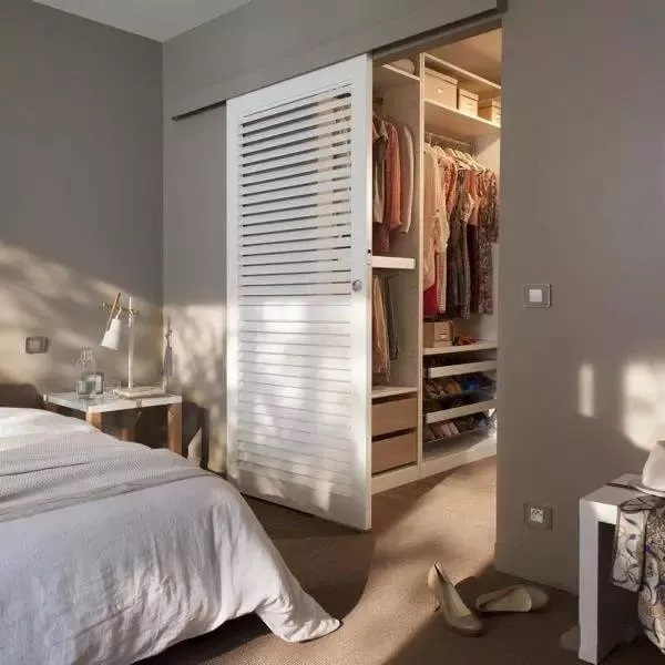 如果整个房间实在是找不出地方可以改造成衣帽间,可以在房间过道上加以利用,两面的墙壁是最好的依托,采用嵌入式设计,内部做好分层工作就可以。