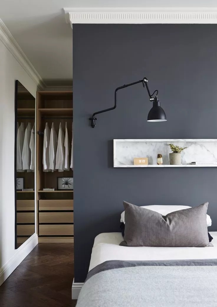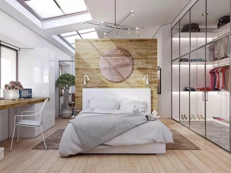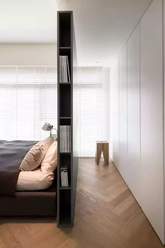 卧室可以充分利用房间的拐角处打造衣帽间,如把卧室床头前移1.2米,在后面设计一个小型衣帽间。