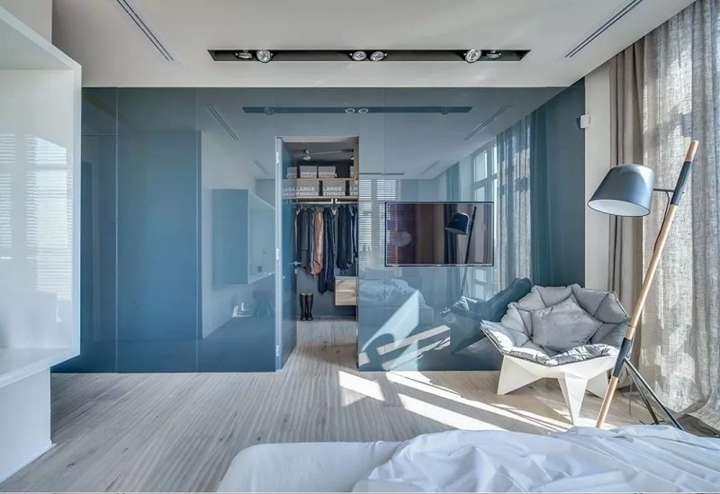 卧室的床对面也可以设计成开放式衣帽间,搭配简洁的玻璃推拉门设计,非常方便实用。
