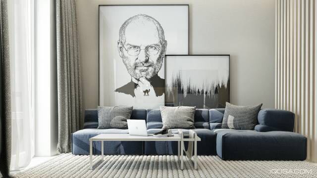 在整个空间史蒂夫·乔布斯的素描画像与一个抽象水墨画相互交错,以平衡整个客厅的几何主题。