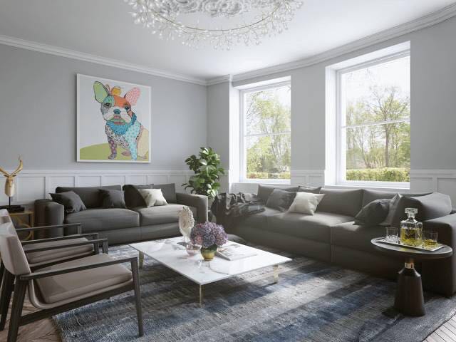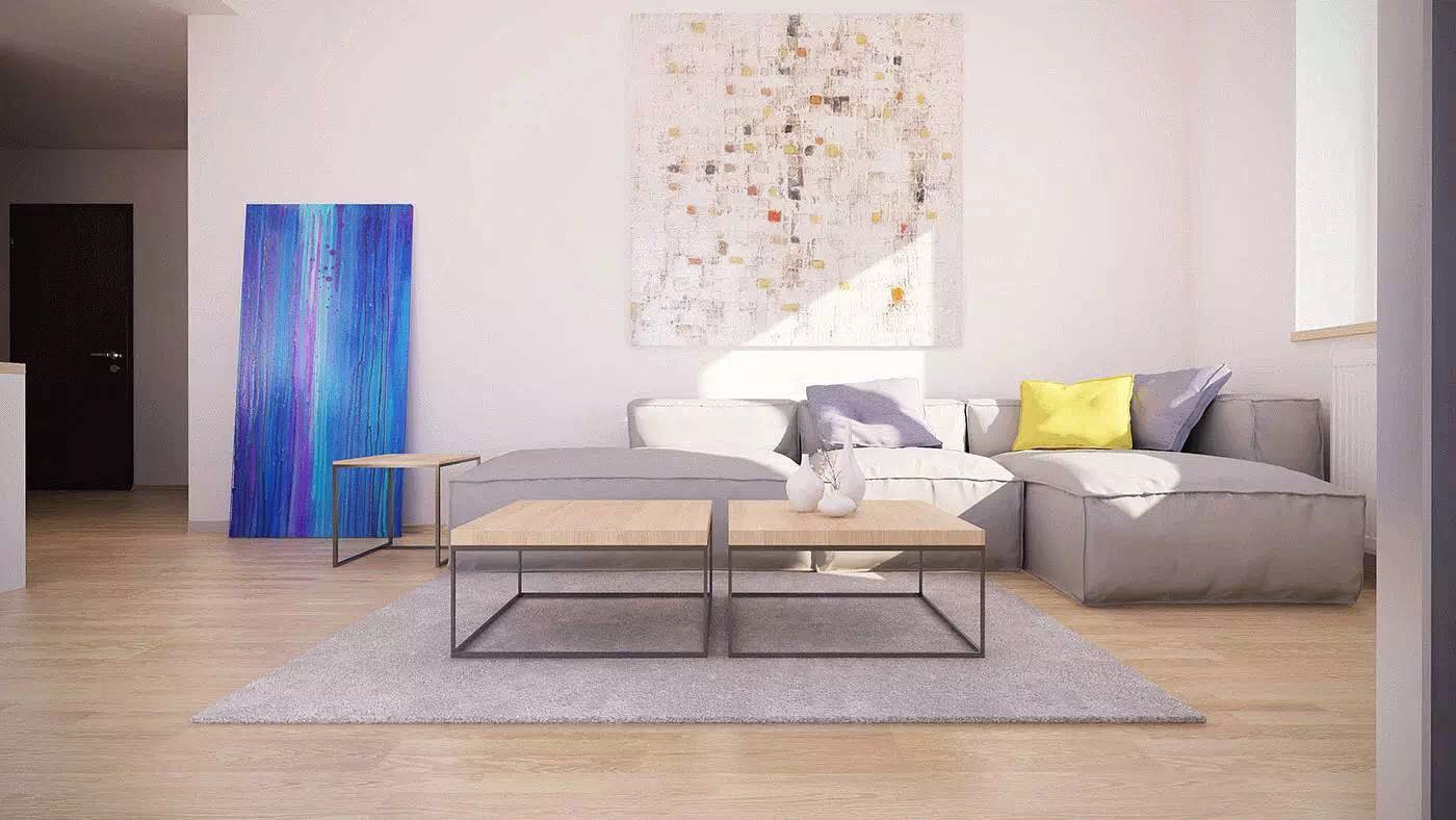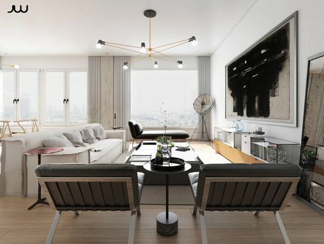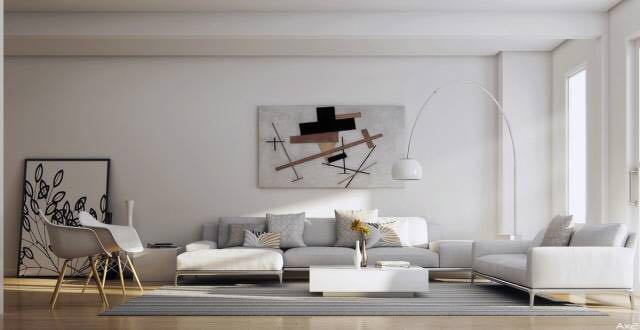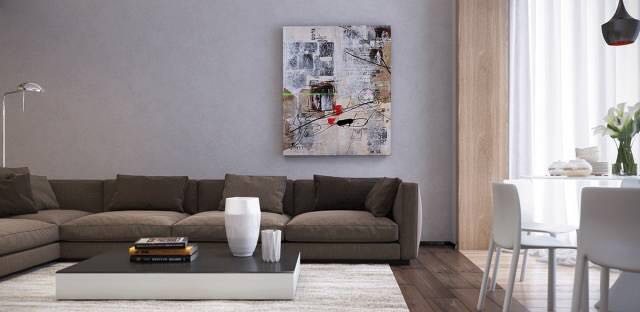 华丽!在这里,抽象版画上的光色调在它们中性背景下显得突出。丰富的家具质感似乎是艺术作品的补充,而不是相反。