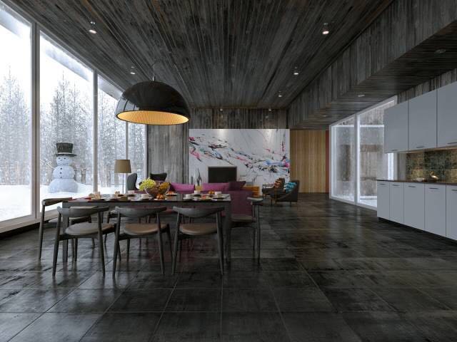 在这里,一幅混合的画布就在客厅和厨房之间过渡。灰色调突出强调了纹理的墙壁与解构形式,形成对比。