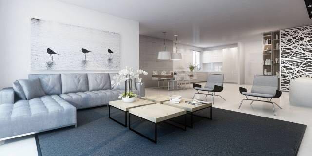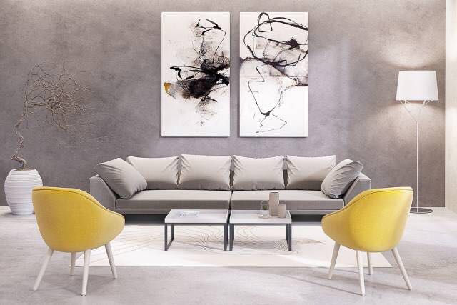 灰度的主题让鲜明的黑白艺术作品从背景中跳出来。客厅那对黄色椅子,使空间才有了生机。