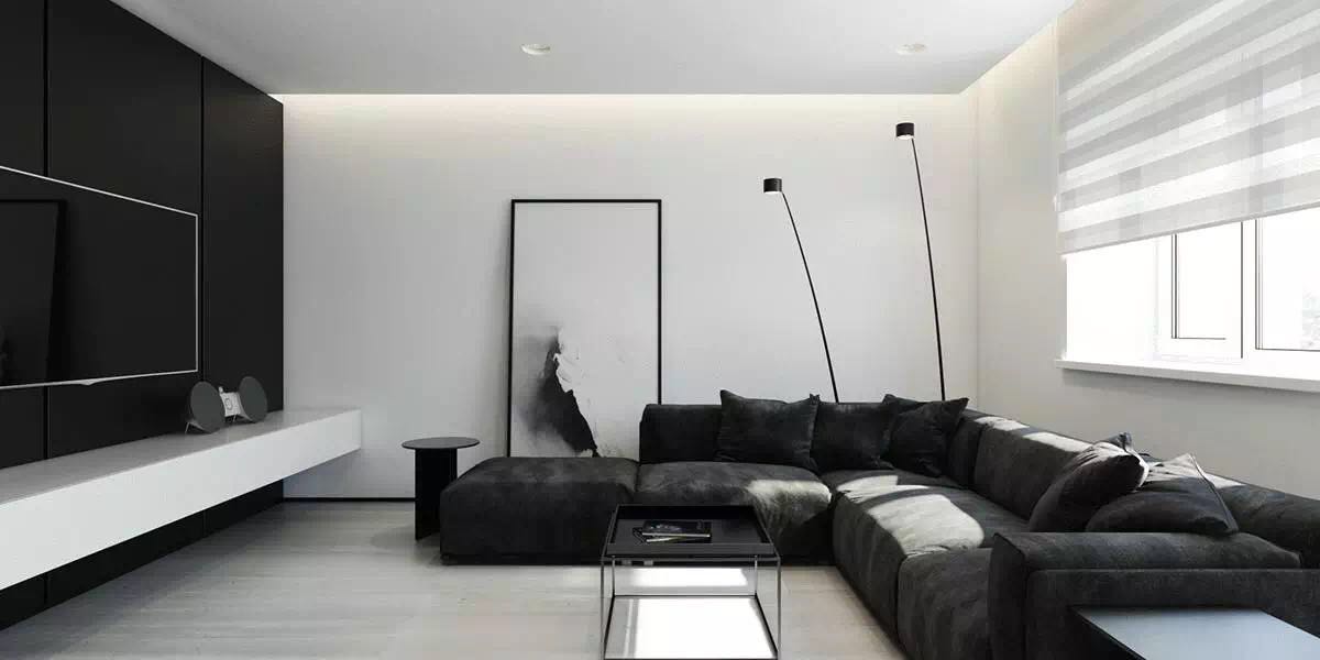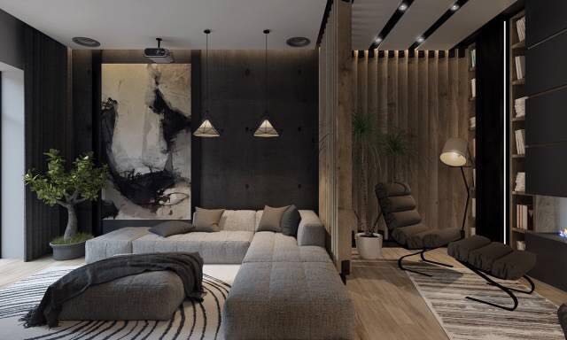 在通常情况下,电视会在装饰画所在的位置,这个空间一幅戏剧性的黑色和灰色的画取而代之,它沉重的色调立刻吸引了目光。