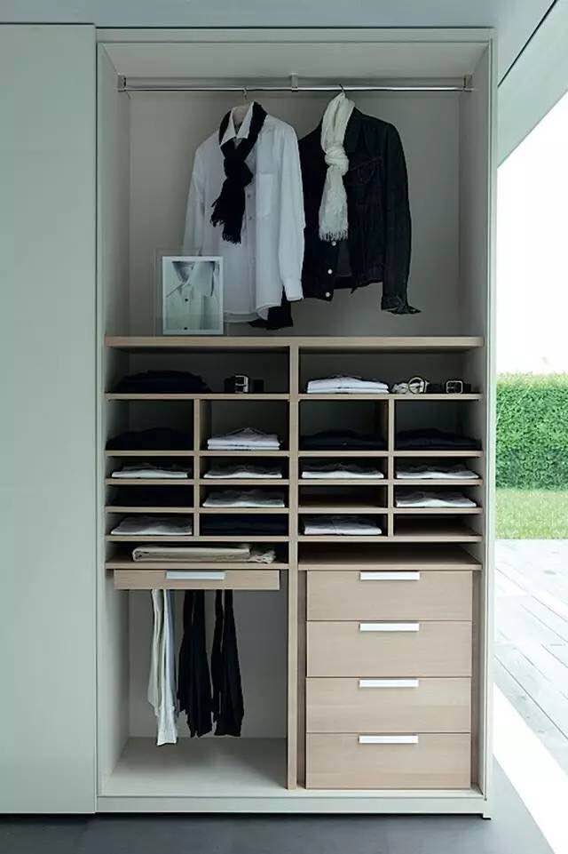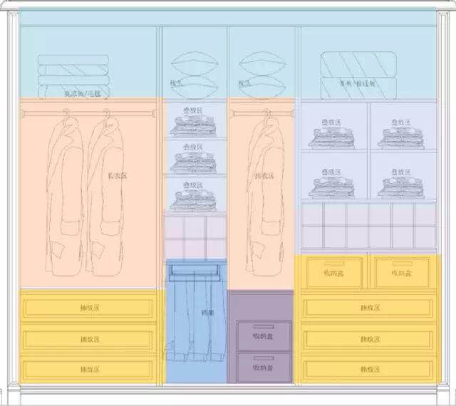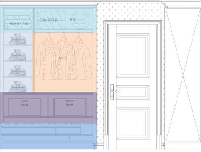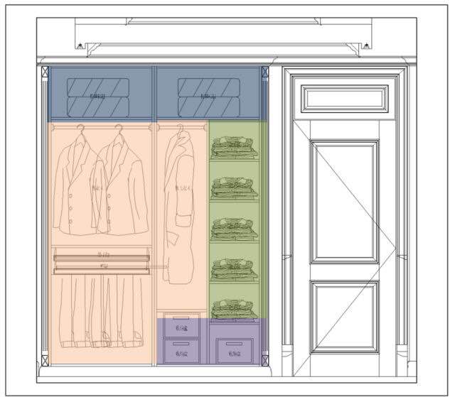 衬衣放置在抽屉或者隔板,以免皱褶变形;毛衣叠放在较深的抽屉里;内衣、领带等小物应采用专门的收纳格;裤子采用专门的裤架晾放。