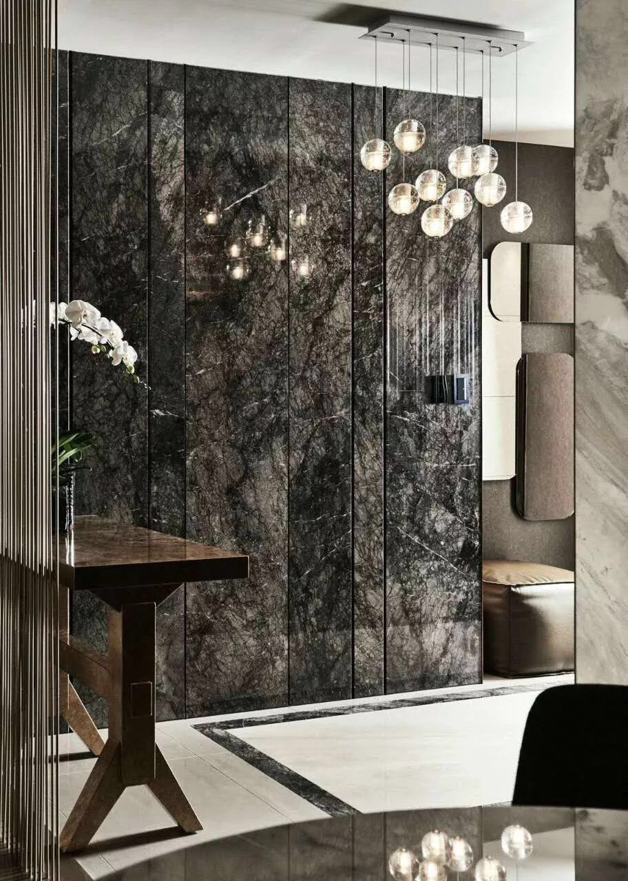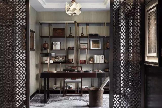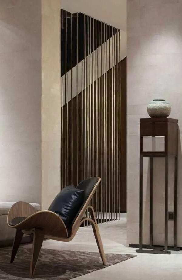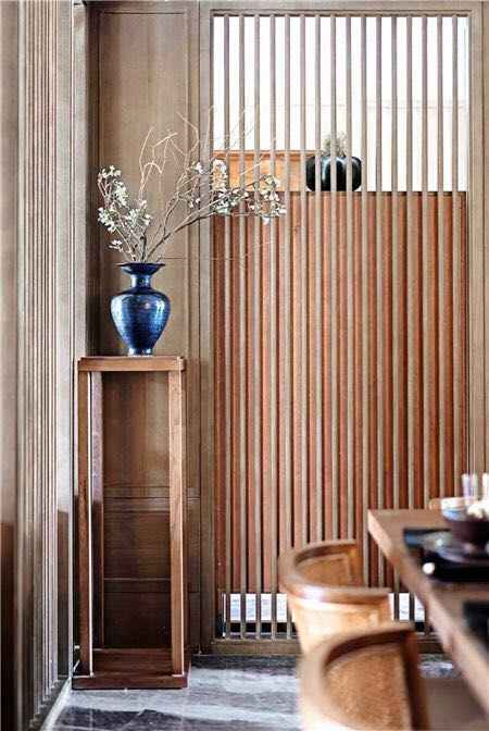 如果觉得原木色的格栅有些单调,也可以选用深色调的格栅,使空间更深沉、低调。这类格栅设计过程中必须要掌握分寸,形式上繁杂可能会缩小实际使用的功能空间。