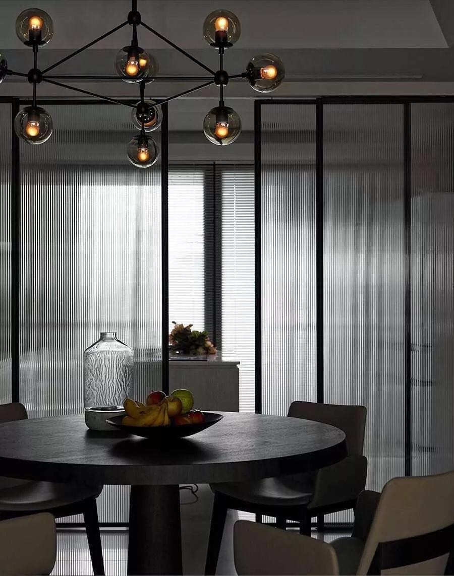在采光条件有限的情况下,想要分隔区域又不影响通透感,可以使用玻璃隔断。玻璃隔断不仅好看、环保而且透光性比较好。磨砂、色彩、花纹,不同的玻璃质地,也将会带来不一样的风格。