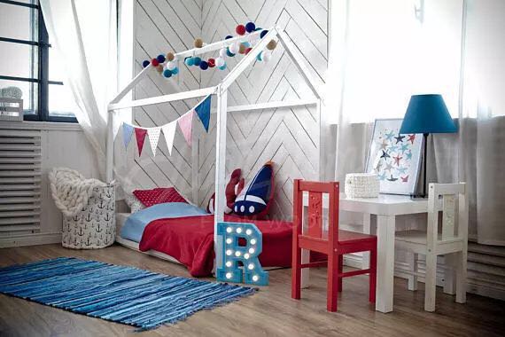 上面说到的teepee帐篷,是小朋友们热爱的小天地。但无奈有些孩子自带拆迁属性,实在不适合容易散架的帐篷。那么,这样一张屋型床就十分有必要啦!房屋的形状同样能给孩子带来安全感,还兼具了床的功能,一举两得!